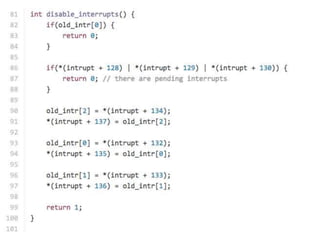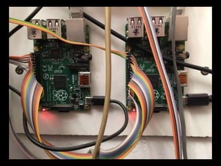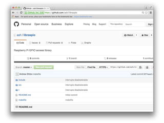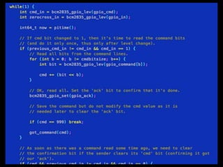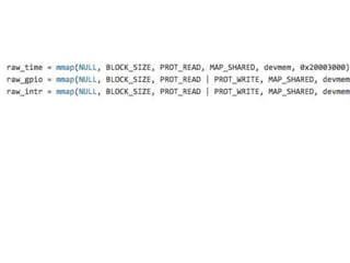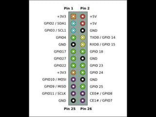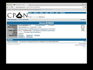 This document discusses using Raspberry Pi's GPIO pins to control LEDs through Perl and C code. It shows how to write to the GPIO pins to turn the LEDs on and off, check their state, and handle interrupts. While Perl code works, C code is much faster for blinking LEDs. The document recommends using Linux, Perl and the GPIO pins on Raspberry Pi for inexpensively controlling multiple LEDs in an easy to use way.