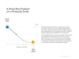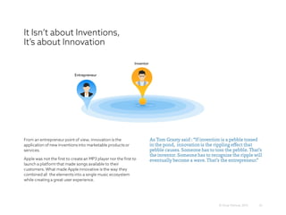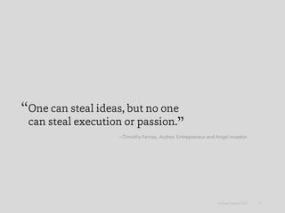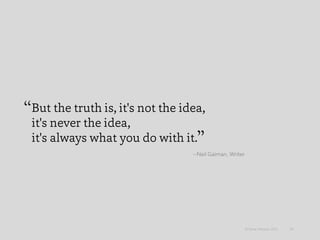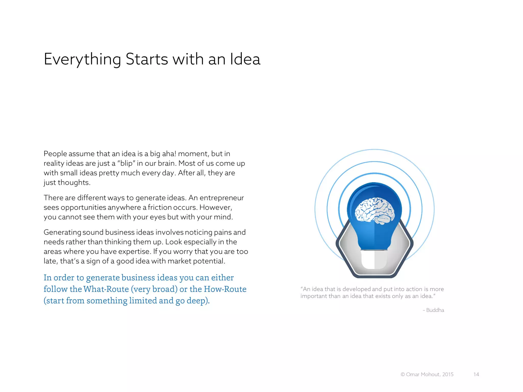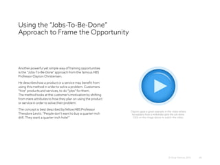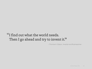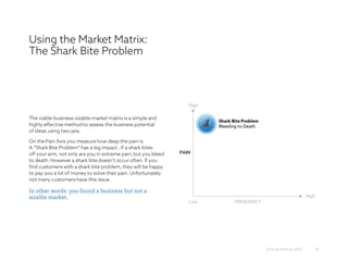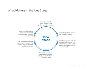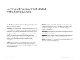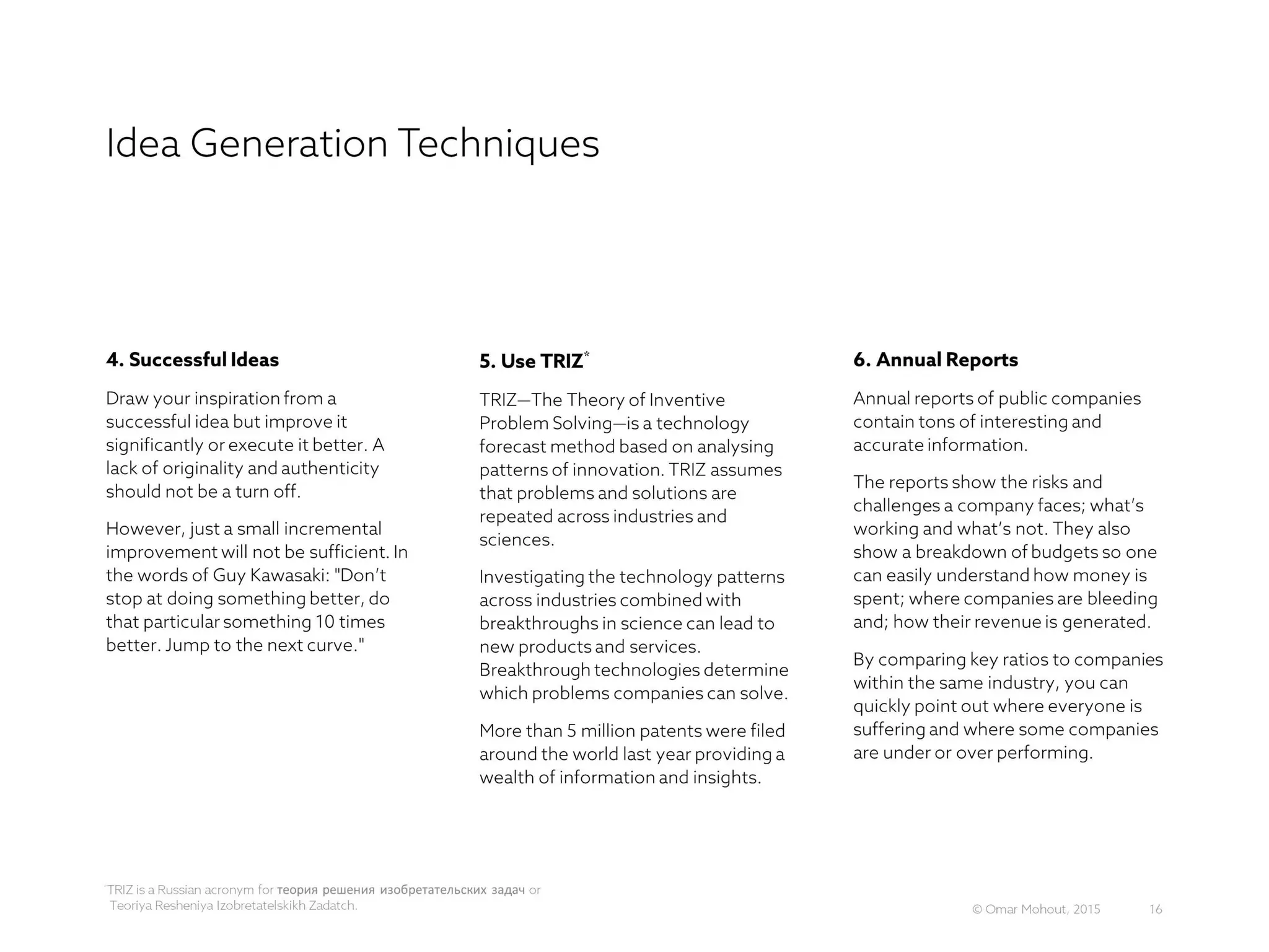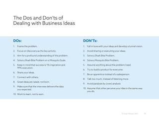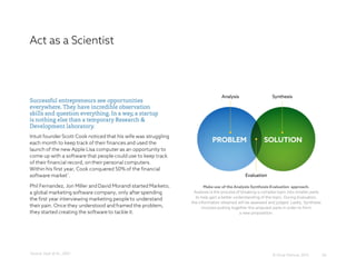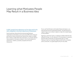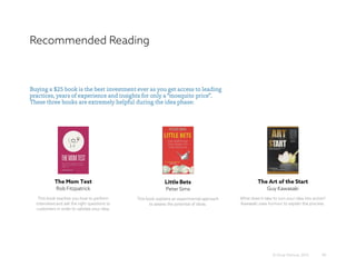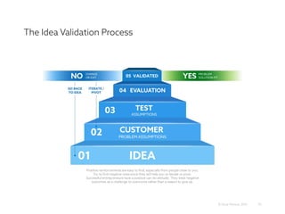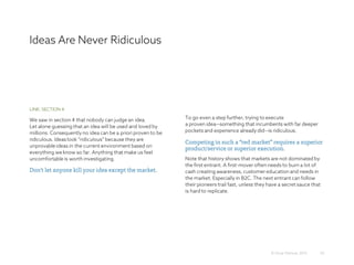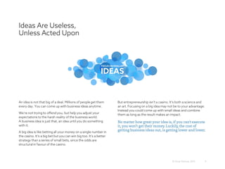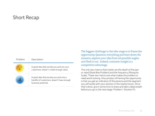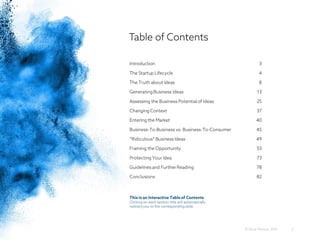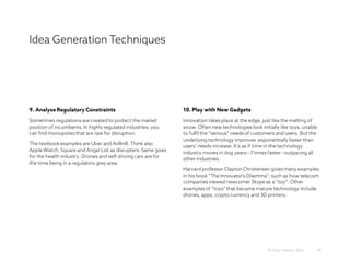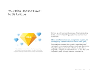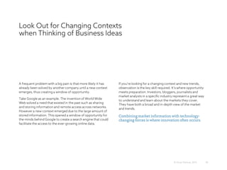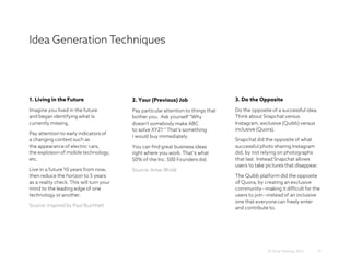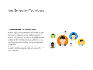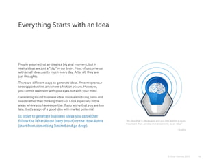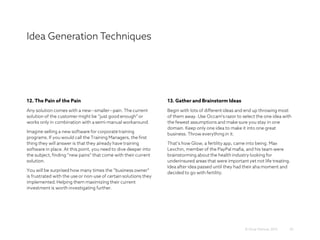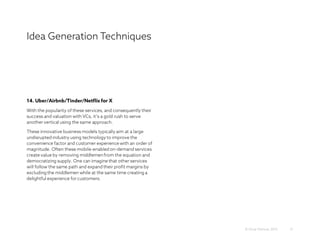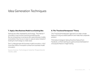 The document provides 14 techniques for generating business ideas, including analyzing problems in one's current or previous job, drawing inspiration from successful ideas but improving them significantly, analyzing annual reports of public companies to find problems and opportunities, and applying new business models to existing ideas. It emphasizes that ideas are useless unless acted upon, and that execution is more important than coming up with a truly unique idea. The key is focusing on validating and scaling ideas, not just generating them.