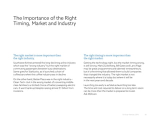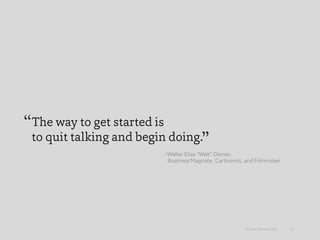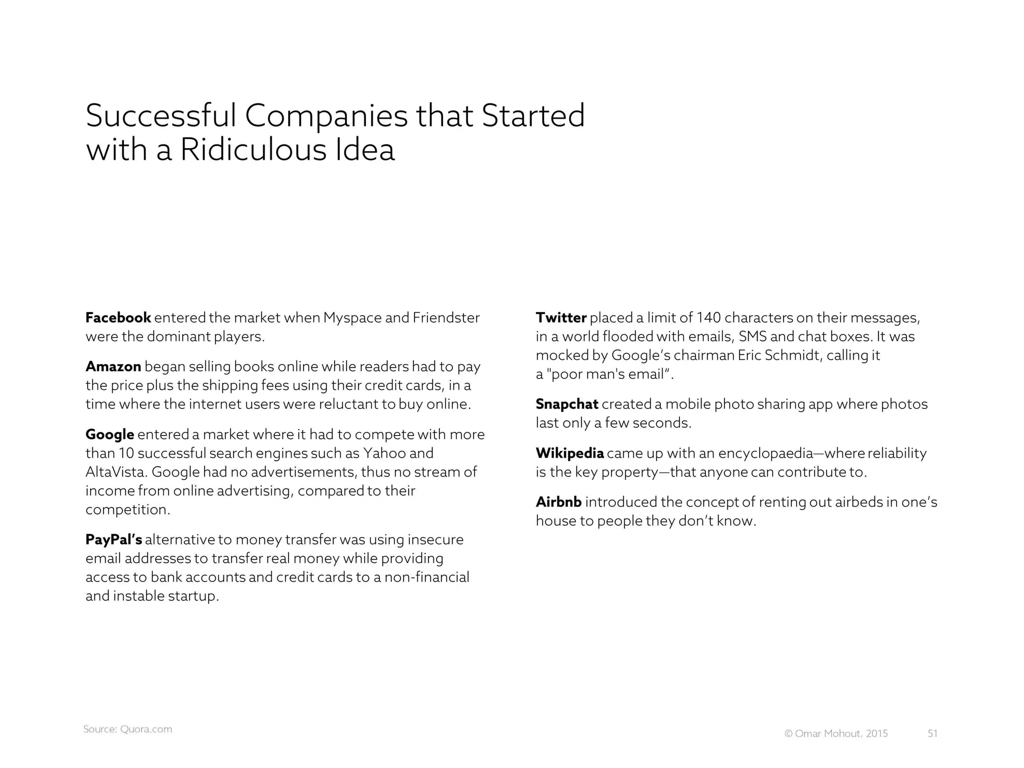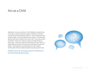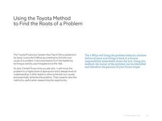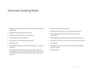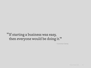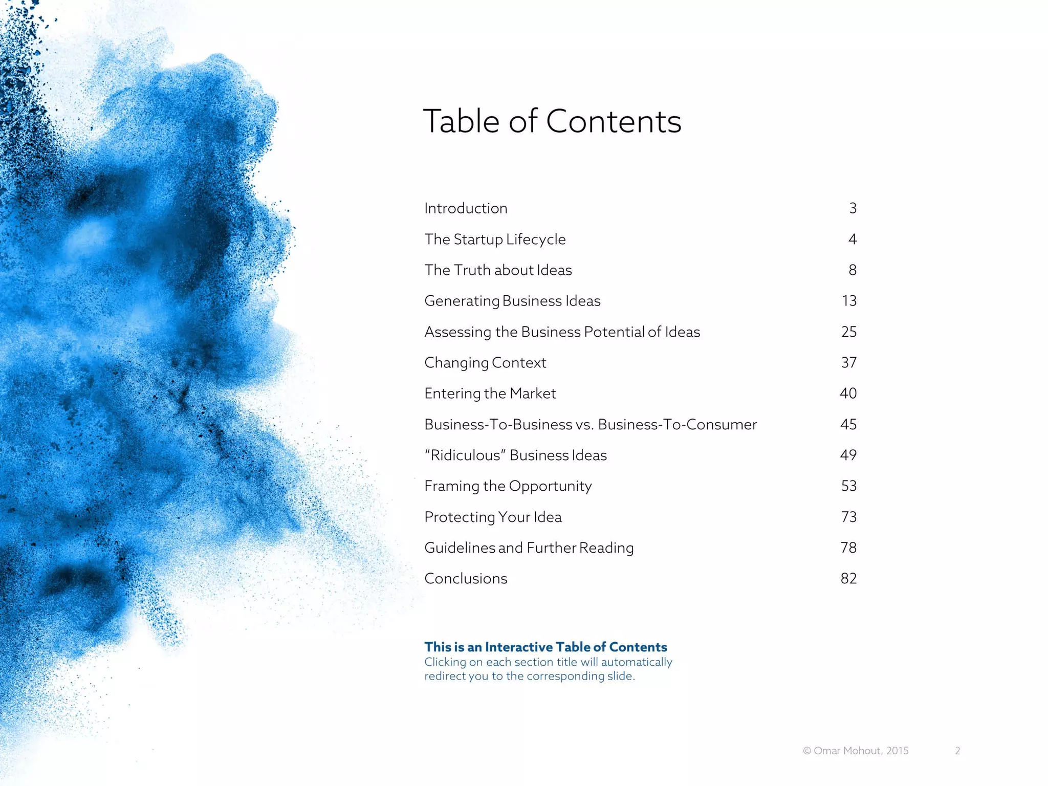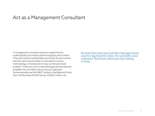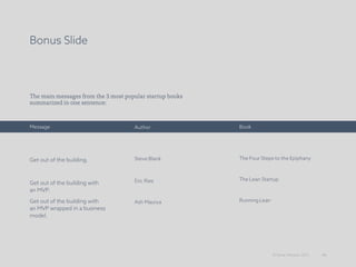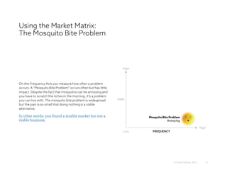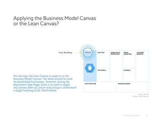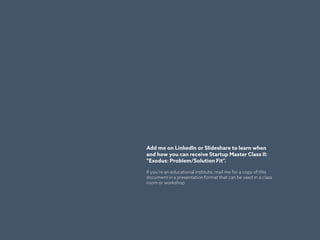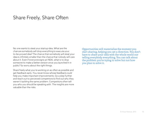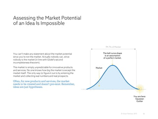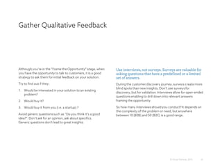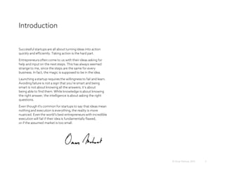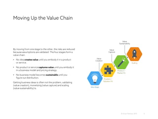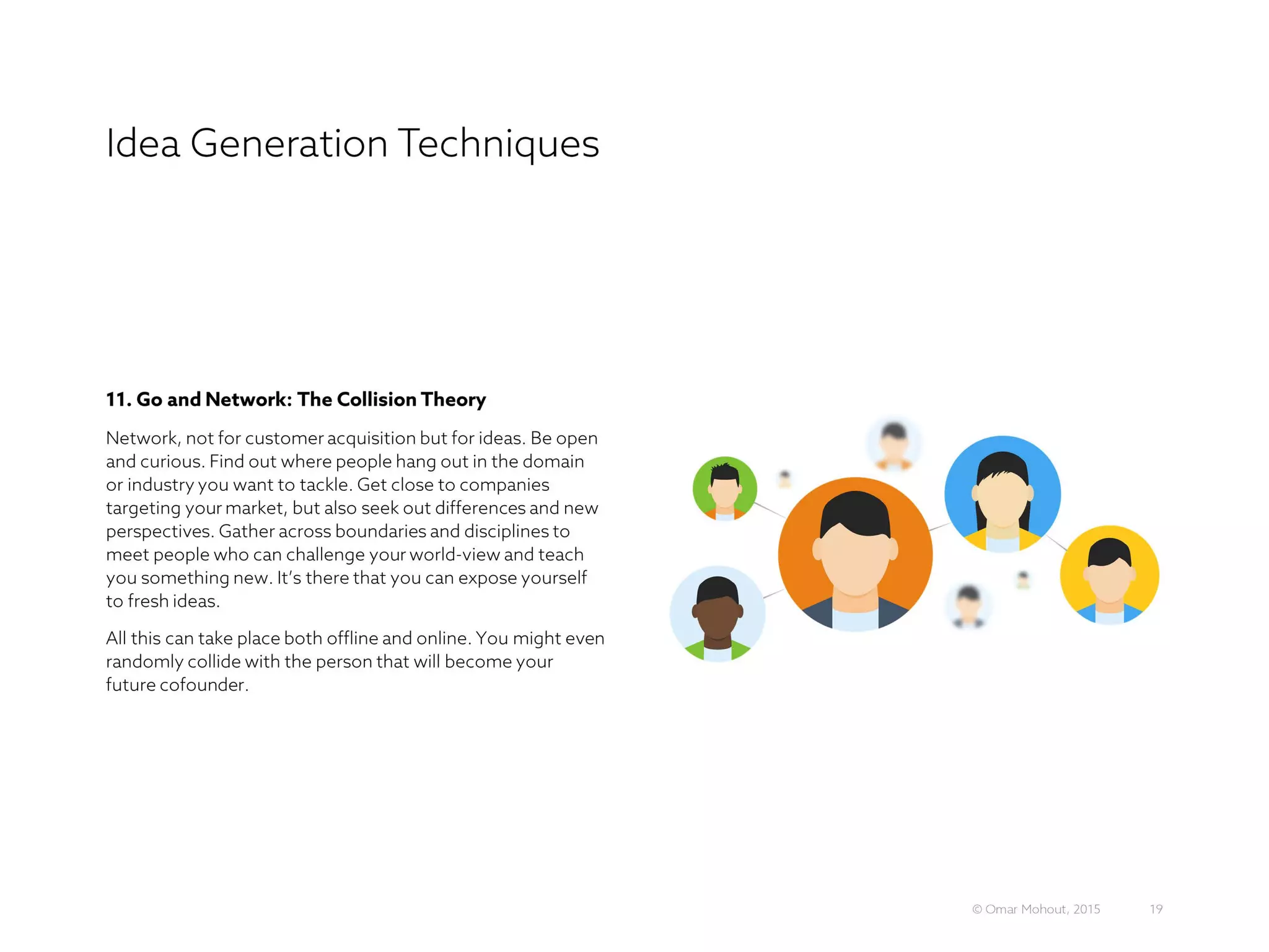 The document provides 14 techniques for generating business ideas, including analyzing problems in one's current or previous job, drawing inspiration from successful ideas but improving them significantly, analyzing annual reports of public companies to find problems and opportunities, and applying new business models to existing ideas. It emphasizes that ideas are useless unless acted upon, and that execution is more important than coming up with a truly unique idea. The key is focusing on validating and scaling ideas, not just generating them.