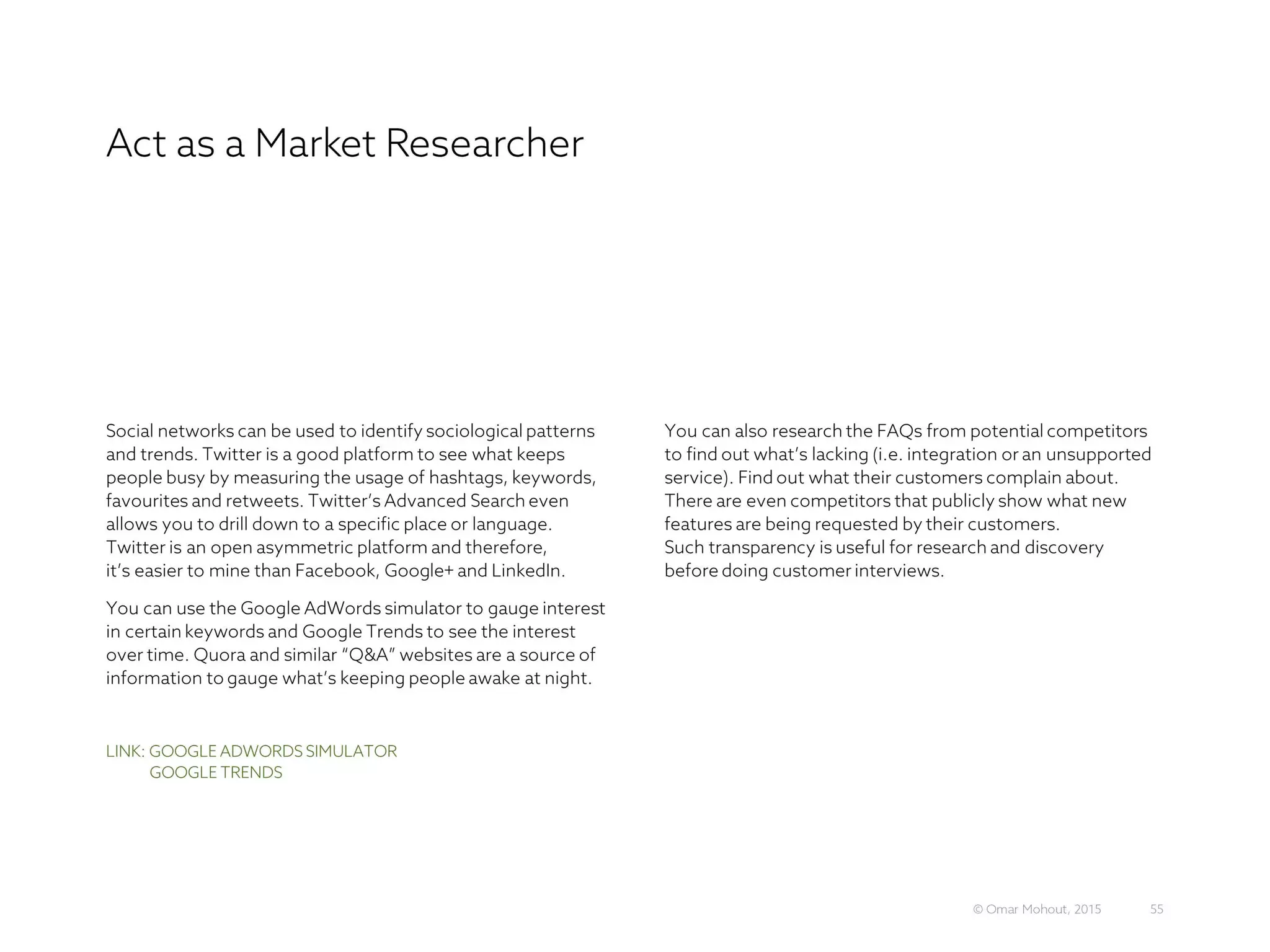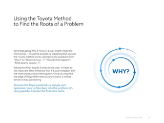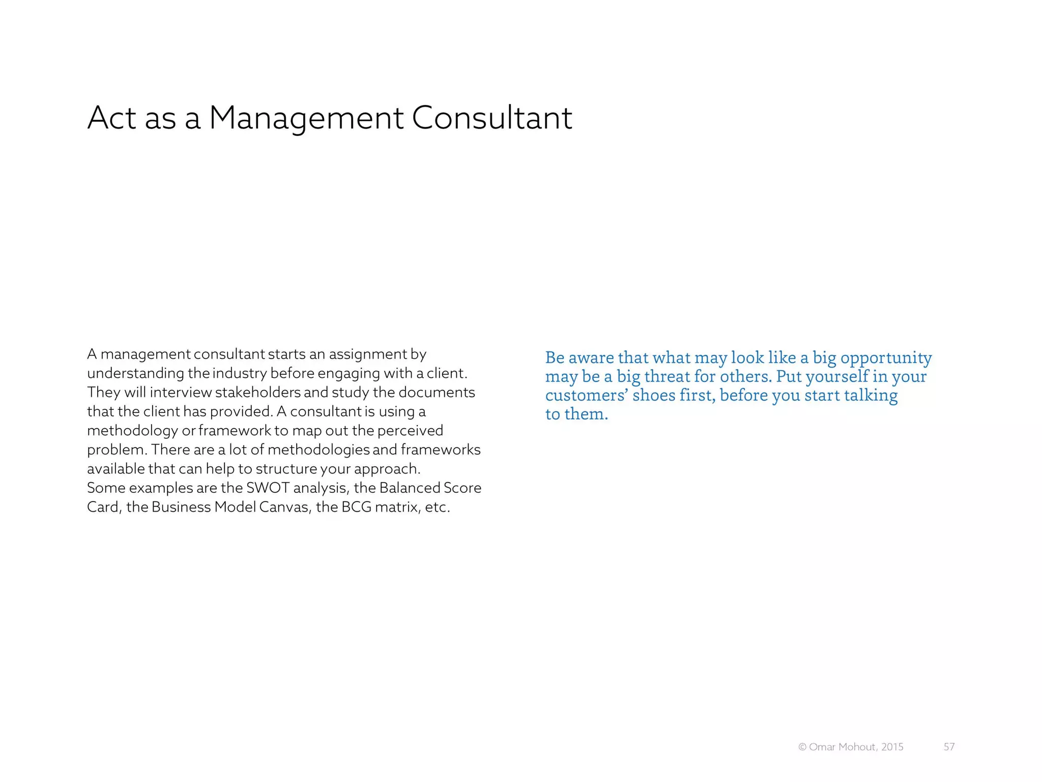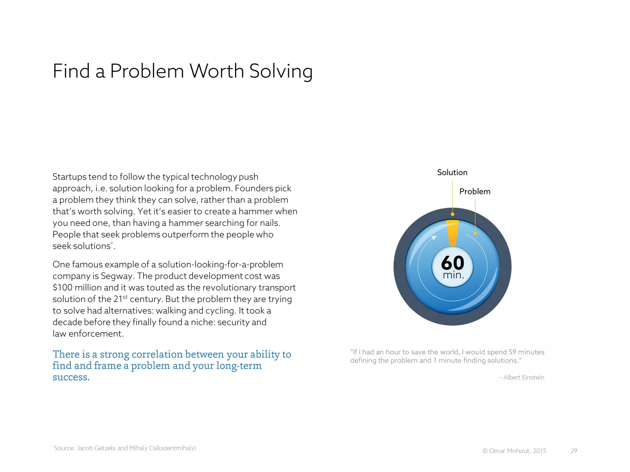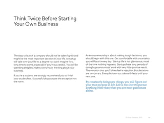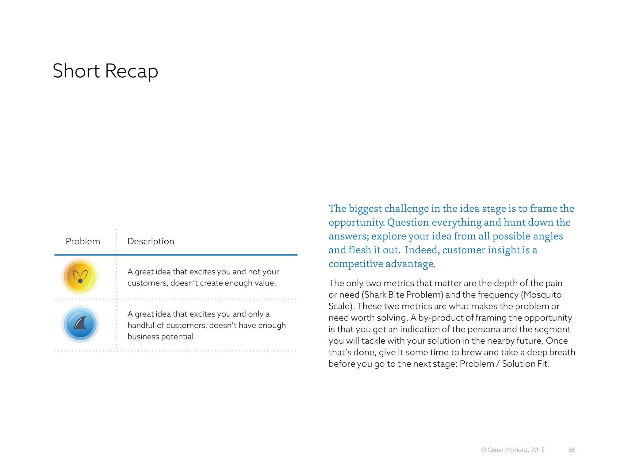 The document provides 14 techniques for generating business ideas, including analyzing problems in one's current or previous job, drawing inspiration from successful ideas but improving them significantly, analyzing annual reports of public companies to find problems and opportunities, and applying new business models to existing ideas. It emphasizes that ideas are useless unless acted upon, and that execution is more important than coming up with a truly unique idea. The key is focusing on validating and scaling ideas, not just generating them.