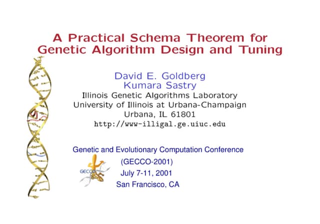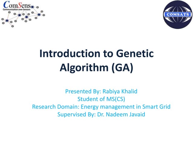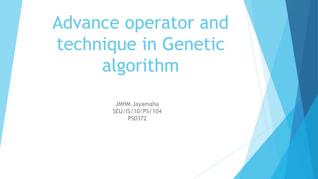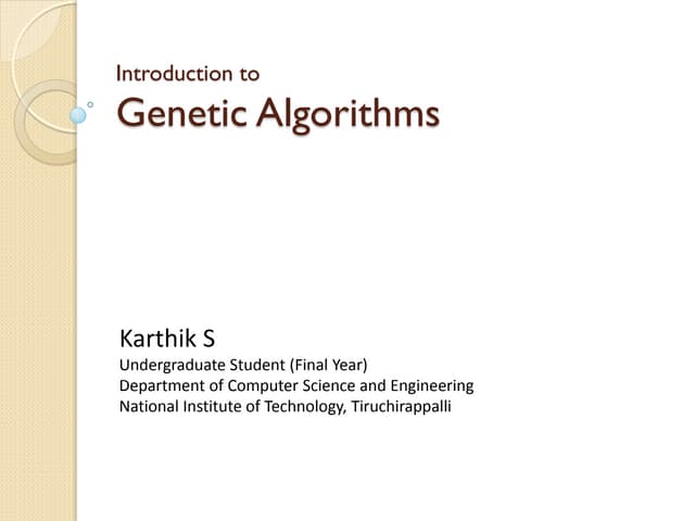 Genetic algorithms are a type of evolutionary algorithm that mimics natural selection. They operate on a population of potential solutions applying operators like selection, crossover and mutation to produce the next generation. The algorithm iterates until a termination condition is met, such as a solution being found or a maximum number of generations being produced. Genetic algorithms are useful for optimization and search problems as they can handle large, complex search spaces. However, they require properly defining the fitness function and tuning various parameters like population size, mutation rate and crossover rate.