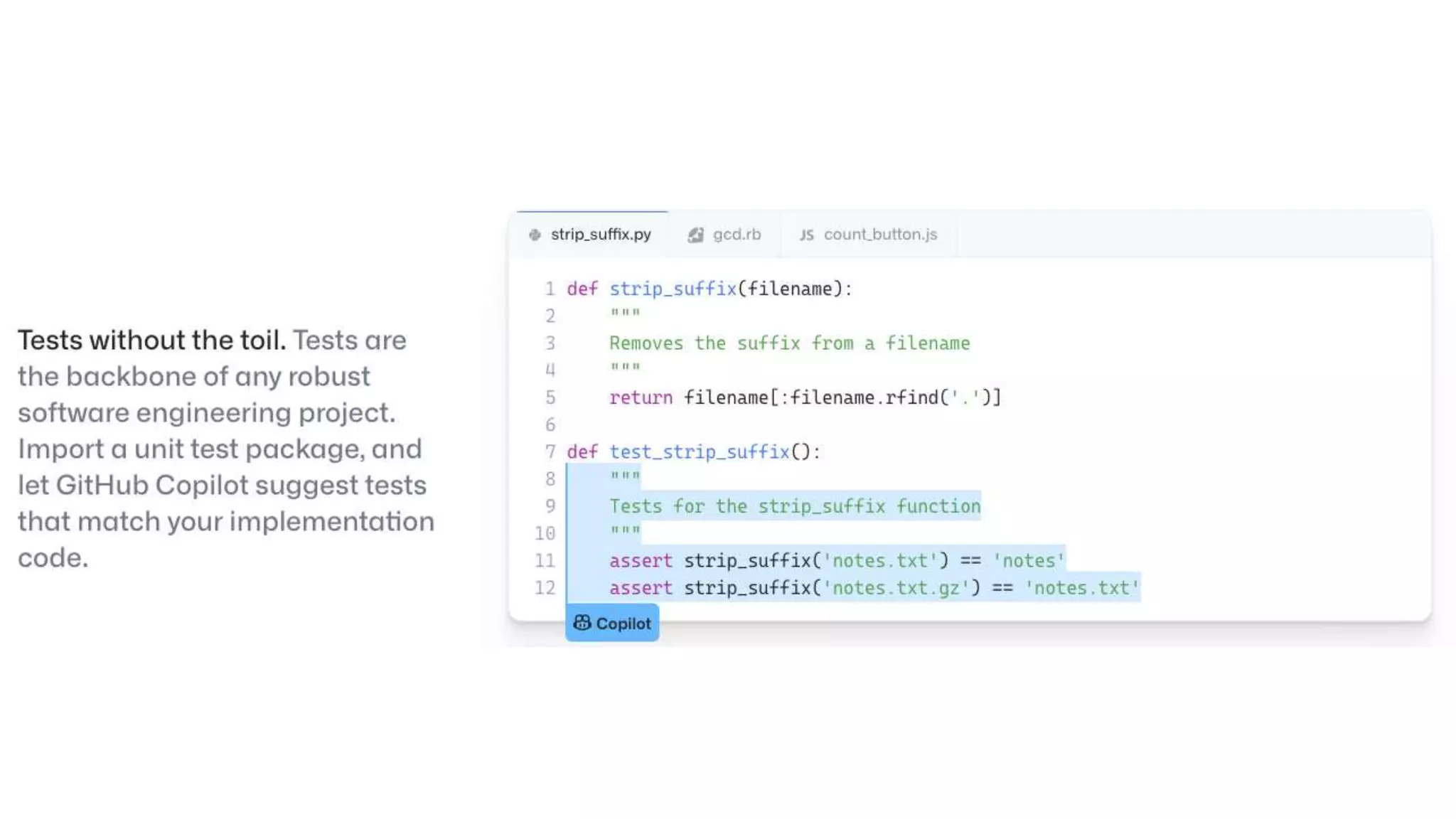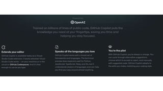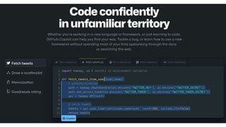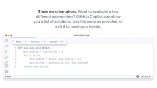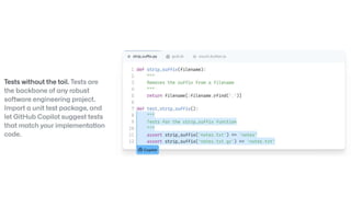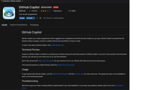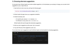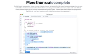GitHub Copilot is an AI assistant created by GitHub to provide code completions and suggestions to developers. It was trained on publicly available source code from repositories on GitHub. The suggestions are uniquely generated and belong to the developer, not GitHub Copilot or its training data. GitHub Copilot collects usage data to improve but does not access or store users' private code. Future versions aim to prevent insecure or offensive outputs through improved filters and a more carefully curated training set.
