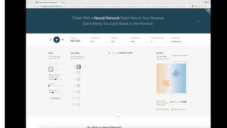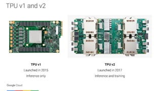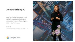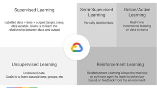 The document discusses Google's vision for AI, focusing on machine learning's evolution and its various applications, particularly in image detection. It outlines three methods to begin with machine learning: using APIs, modifying existing models, or creating new models. Additionally, it highlights developments in TensorFlow and Google's AI research, emphasizing the transformative impact of machine learning on technology.