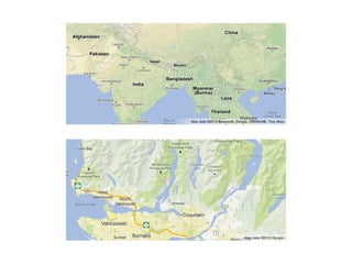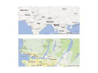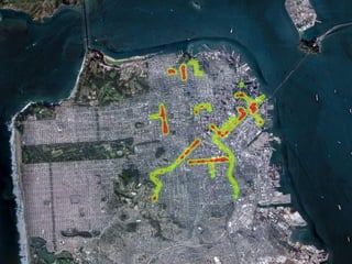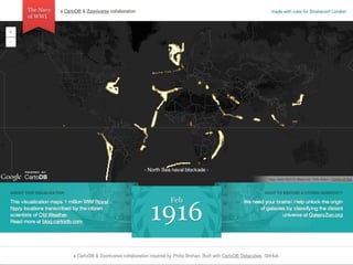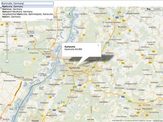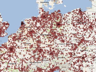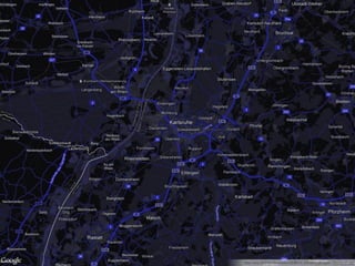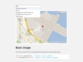 The document discusses the Google Maps API which provides over 150 features for adding maps and mapping capabilities to web and mobile applications. It covers core map components like controls, overlays, and layers as well as services for geocoding, directions, elevation, street view and places. It also discusses customizing maps with styles, icons and tilt/heading controls as well as using the API across different languages and platforms. The document provides examples of common API tasks like placing markers, handling user input and clustering large datasets.