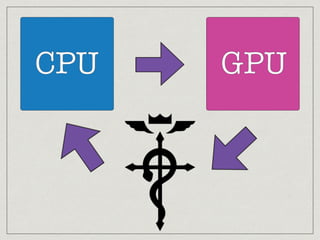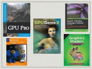 The document discusses GPU programming, focusing on graphics processing using technologies like GPUImage and Metal. It explains concepts such as parallel computing, shaders, and the evolution of OpenGL to OpenGL ES, highlighting the efficiency of GPUImage for image processing and the advantages of Metal for general-purpose GPU programming. It encourages understanding the mathematics behind shaders and emphasizes the importance of mastering these technologies despite their complexity.