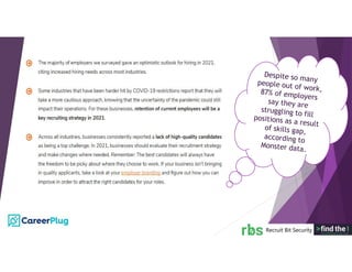 The document provides tips for job seekers on "hacking hired" in cybersecurity careers. It discusses four key vectors to focus on: tools, technology, people, and organizations. For each vector, it highlights important trends for 2021 and strategies. These include tailoring cover letters and social profiles to employers, leveraging video interviewing and automation appropriately, networking extensively, and standing out within the first few minutes of interviews. The document aims to help job seekers understand hiring processes and craft effective strategies for their unique situations.