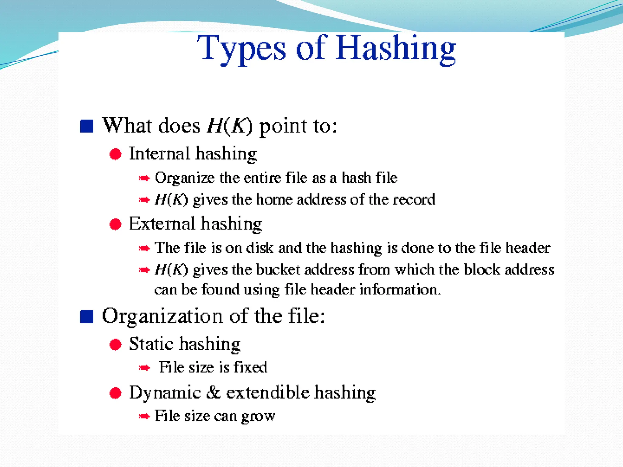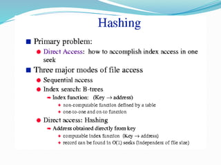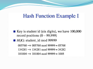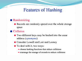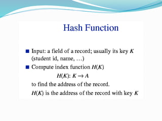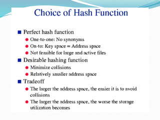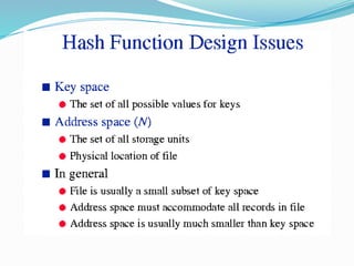 The document discusses hashing, a method for efficiently storing and retrieving data through hash functions that map keys to array indexes. It explains the advantages of hashing over binary search, the structure of hash tables, and various collision resolution strategies like separate chaining and linear probing. Additionally, it covers the design considerations for hash functions and the performance metrics required for effective data access.