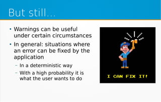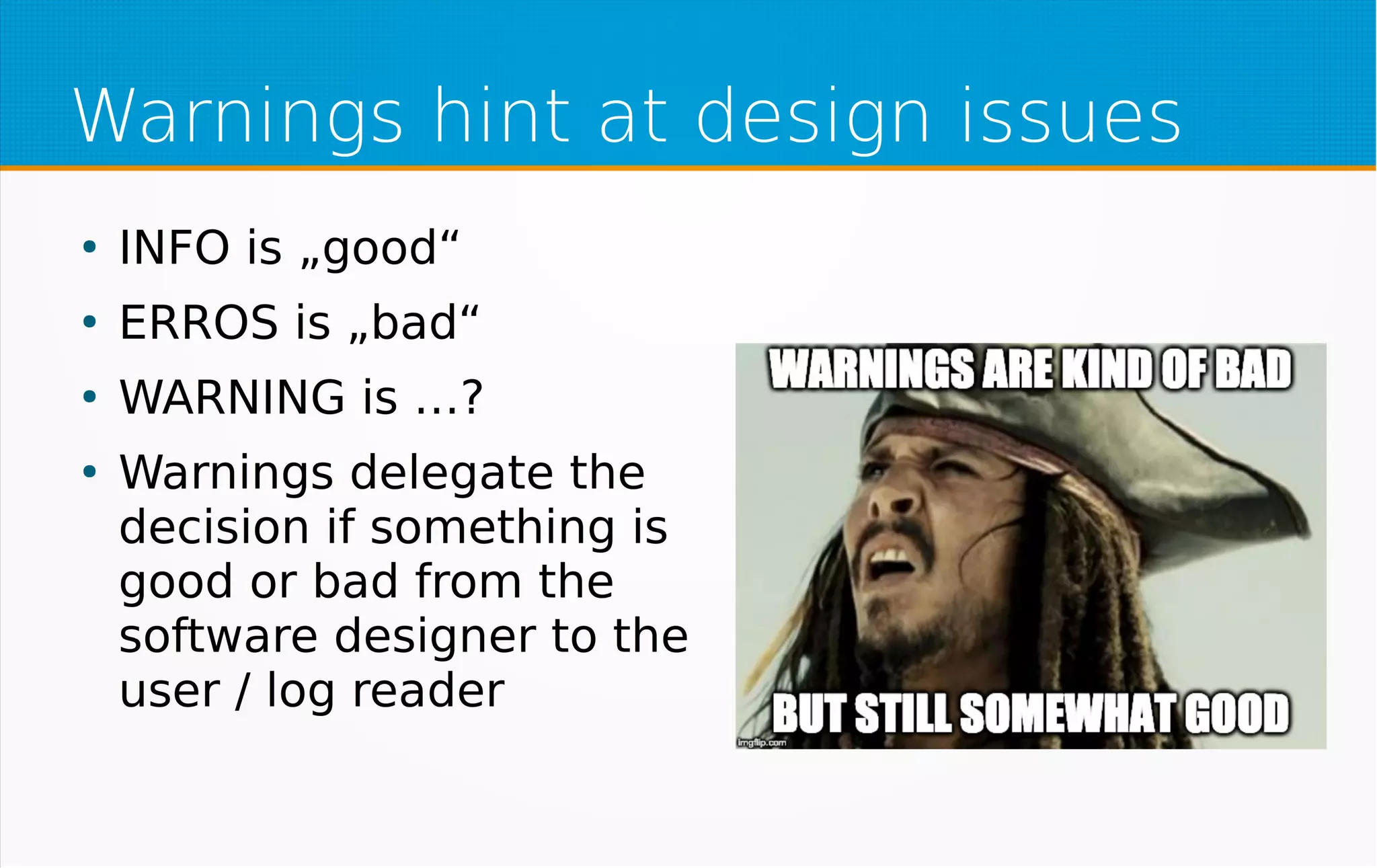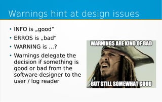 Discusses the nature of warning messages indicating design issues; includes examples of reduced service quality.Focus on logging for developers, enabling debug messages temporarily for issue tracking.Summarizes key aspects of INFO, ERROR, CRITICAL, WARNING, and DEBUG logging best practices.