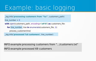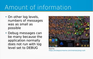 Discusses various log levels (INFO, ERROR, CRITICAL, WARNING, DEBUG) and when to use them.