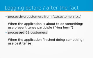 The document is a comprehensive guide on logging practices for software developers, detailing different log levels including info, error, critical, warning, and debug. It emphasizes the importance of context in log messages, appropriate wording for different situations, and guidelines for when to log or raise errors. The content also provides templates and examples for effective logging to aid in tracking and troubleshooting application behavior.