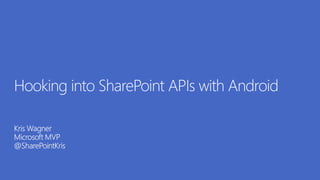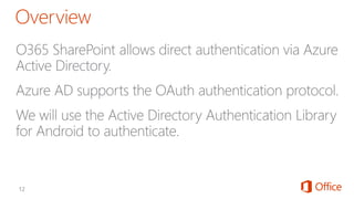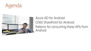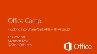 This document provides an agenda for an Office Camp module on hooking Android apps into Office 365, SharePoint, and other Microsoft APIs. The agenda includes modules on setting up development environments, connecting to apps for SharePoint, Office 365 APIs, Apps for Office, and SharePoint APIs from Android. It also provides code samples and documentation for using the Azure Active Directory authentication library and Office 365 SDK for Android to authenticate users and make API calls to SharePoint and Office 365 from an Android app.