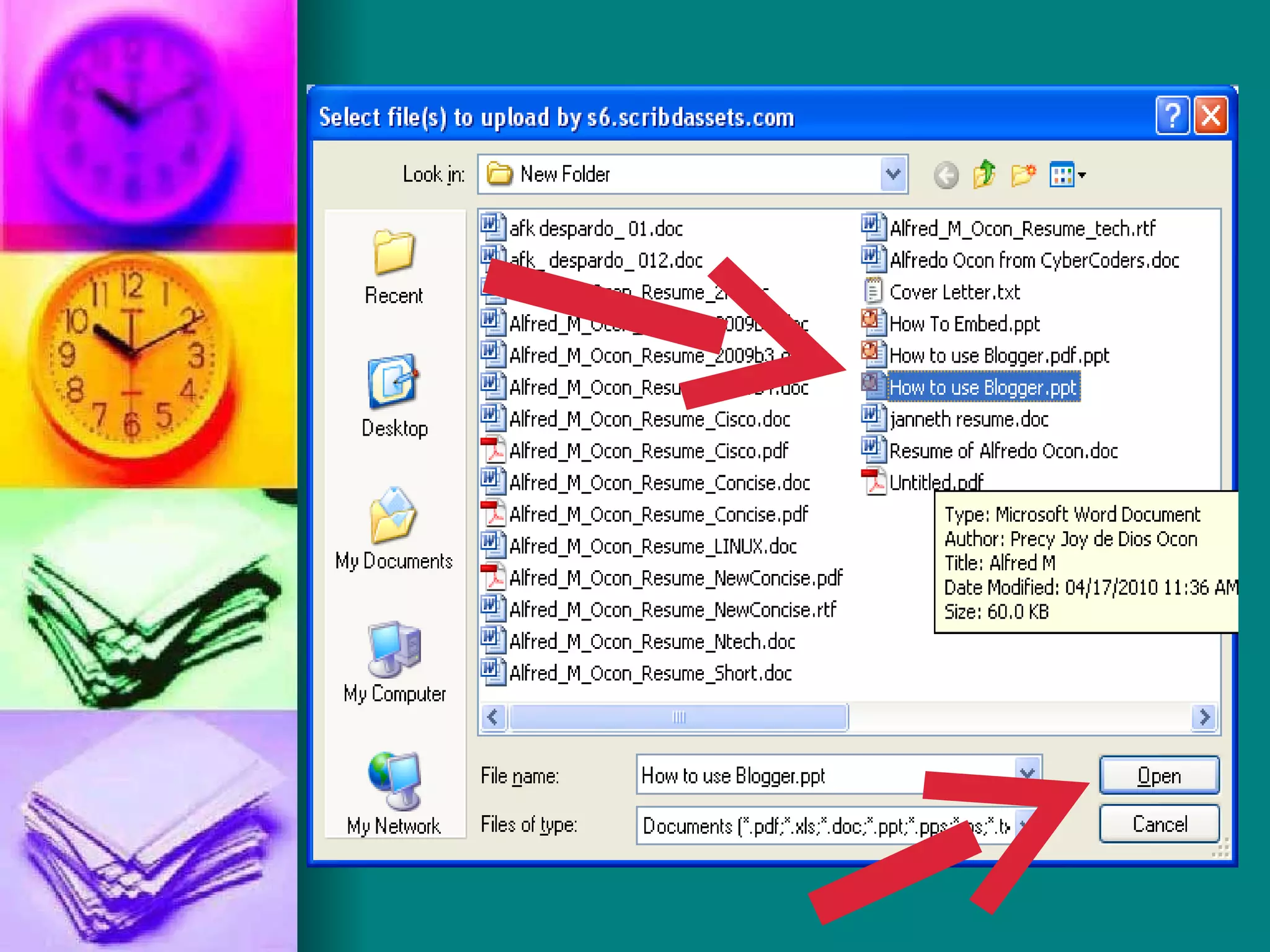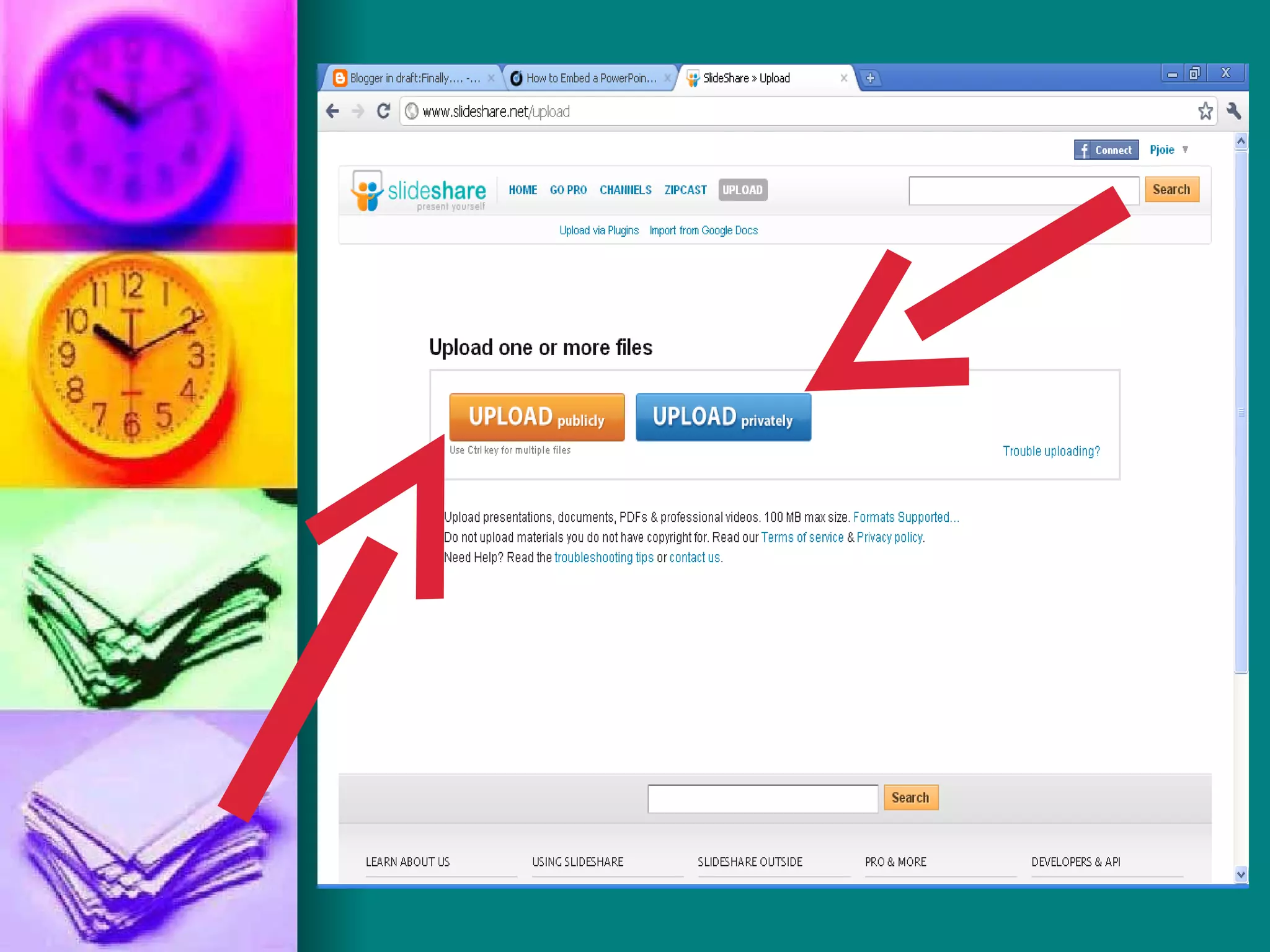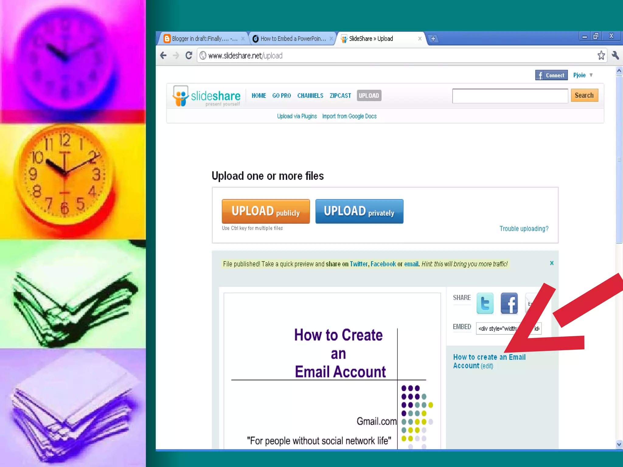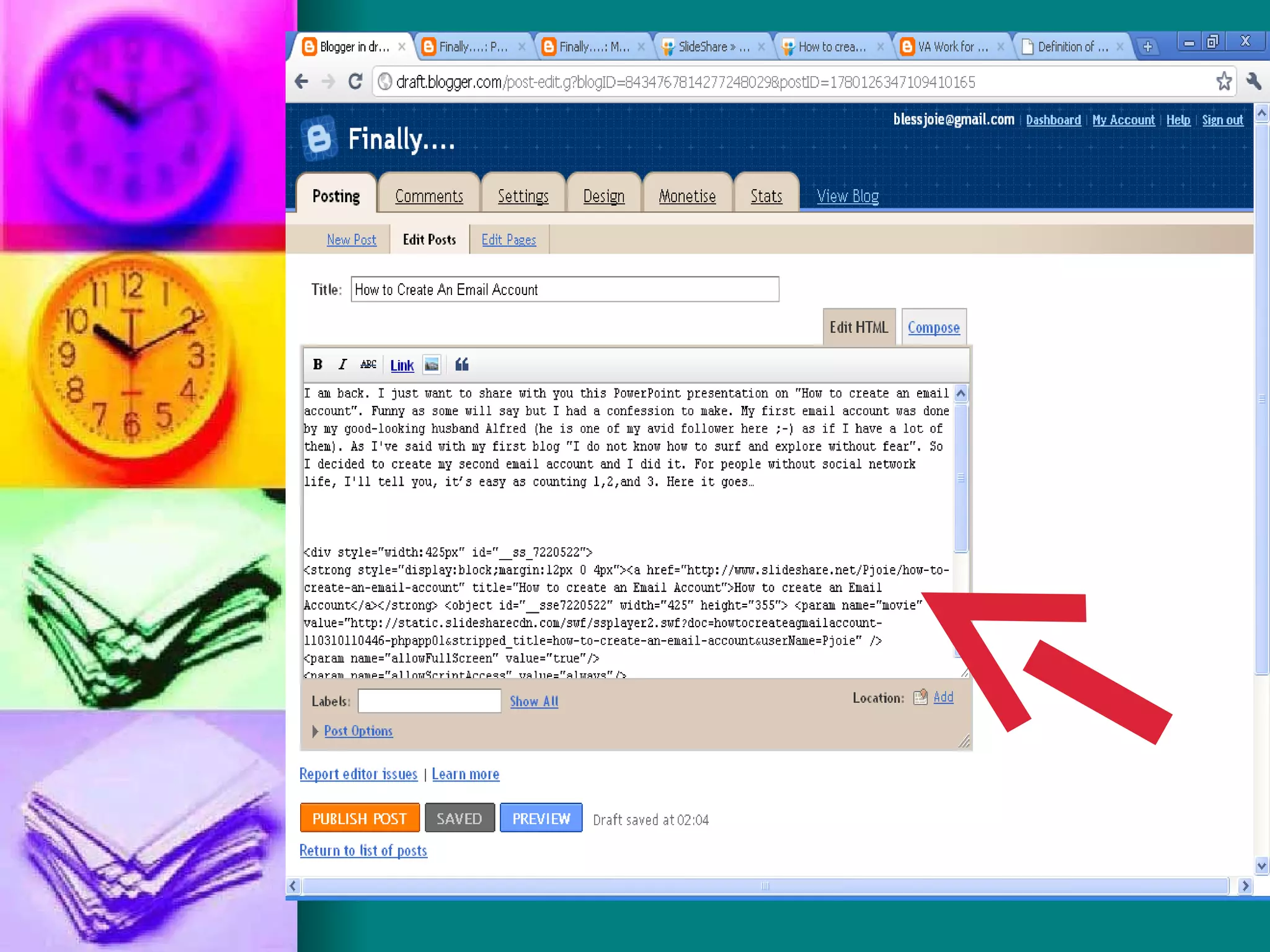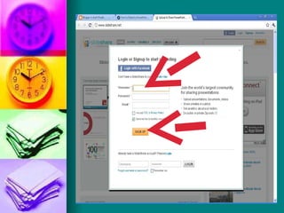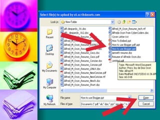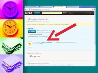 The document provides instructions for embedding a PowerPoint presentation into a blog using SlideShare or Scribd. It describes uploading the presentation to those sites, copying the embed code provided, and pasting it into the HTML of the blog post. It notes to preview the post before publishing to ensure the embed displays correctly.