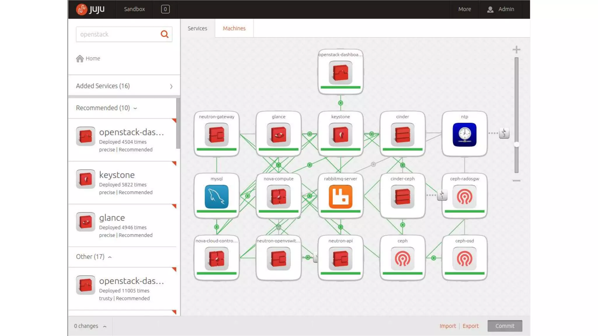 Deploy Charm(Service) andRelate Charms Type CLI command or search the charm on charm store juju deploy <service as you want> Connect between charms(services) juju add-relation <charm 1> <charm 2> Expose public IP for external access juju expose <charm name to expose>
