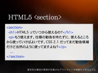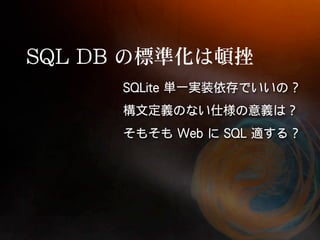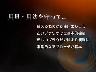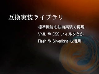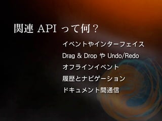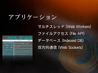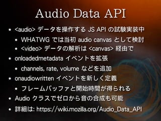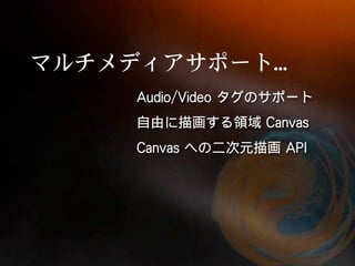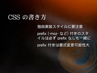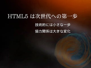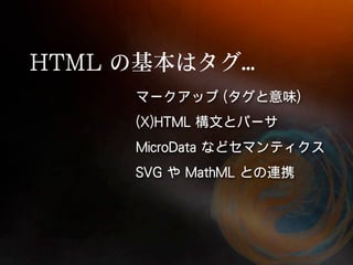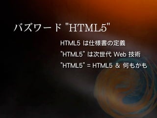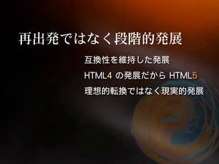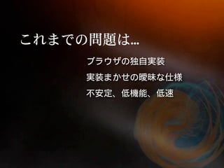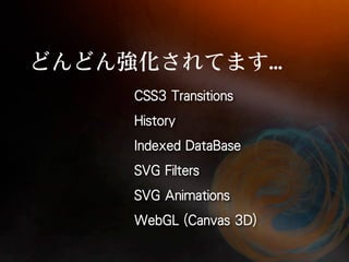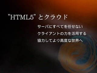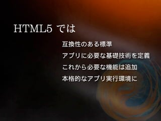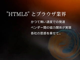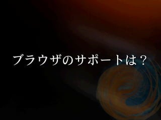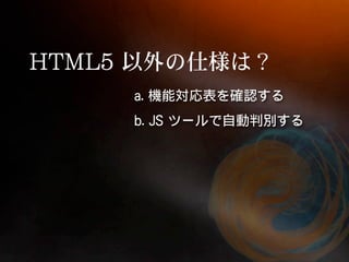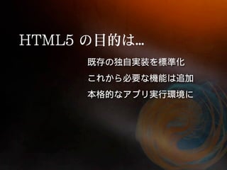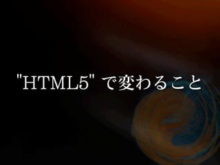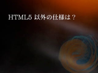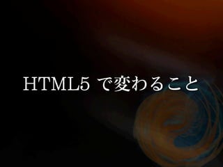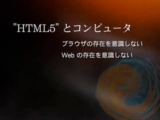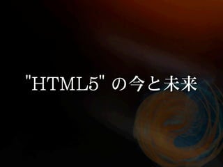 This document is a presentation on HTML5 and beyond given by Tomoya Asai at JSiSE at Hokkaido University. The presentation covers the current state and future of HTML5, browsers, JavaScript APIs, and new web technologies. It provides examples and references to specifications, browser implementations, and demos related to HTML5 features such as semantic markup, forms, canvas, WebSockets, geolocation, and more.