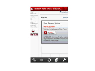 The document discusses the HTML5 canvas, a feature that allows for scriptable images and various graphical possibilities. It outlines its standard API methods for drawing and mixing with external graphics, while noting the absence of an IDE and the potential of canvas as an alternative to Flash. Challenges such as performance issues are mentioned, but improvements are underway with advancements in JavaScript and rendering engines.