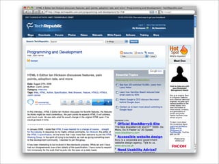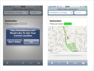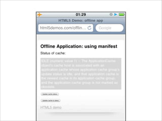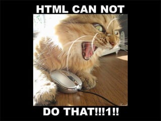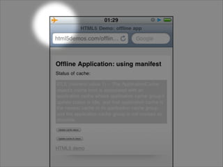 The document discusses HTML5 features and improvements, including support for audio, video, and new APIs like geolocation and drag-and-drop functionality. It emphasizes the ease of use with elements for document structure and interactivity. There are also sections addressing browser compatibility and ongoing development resources.