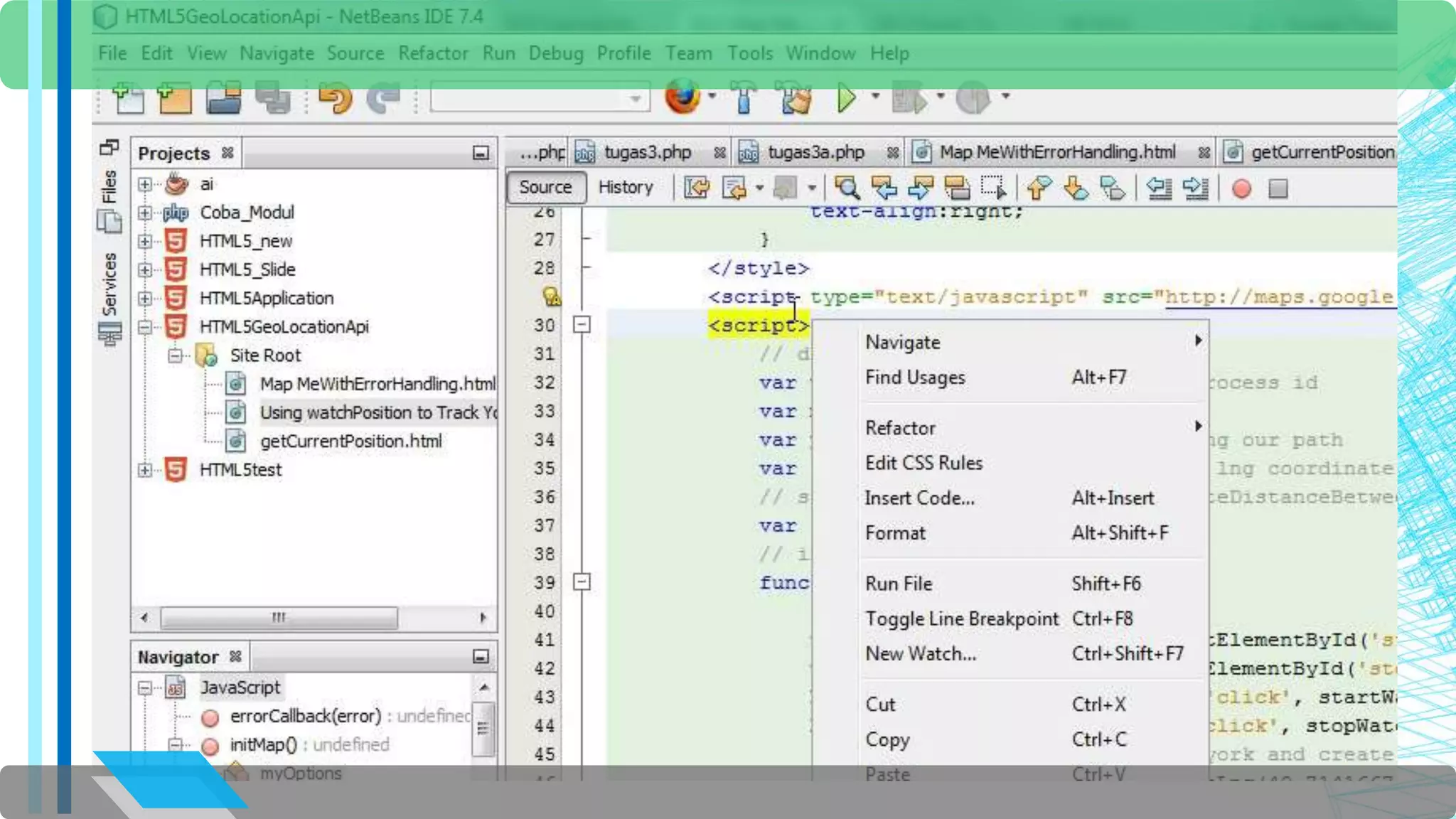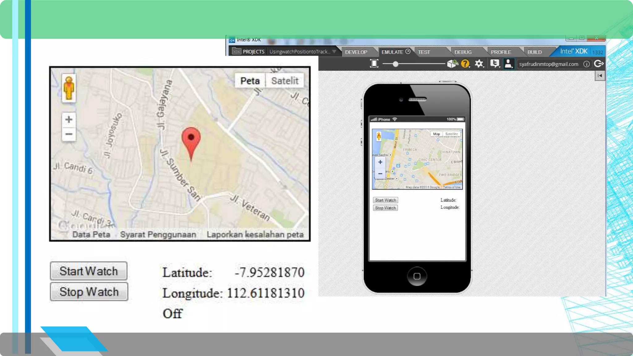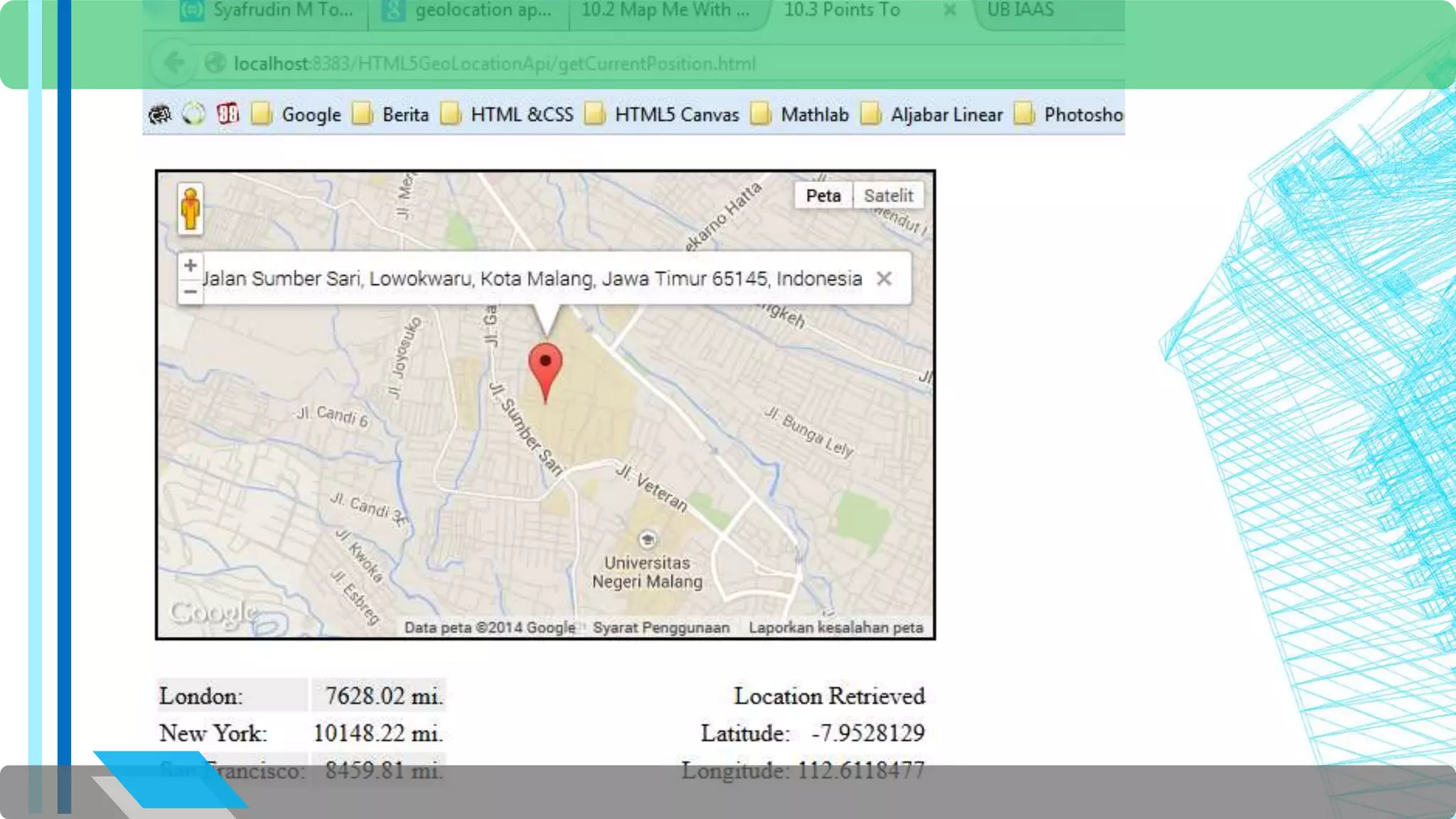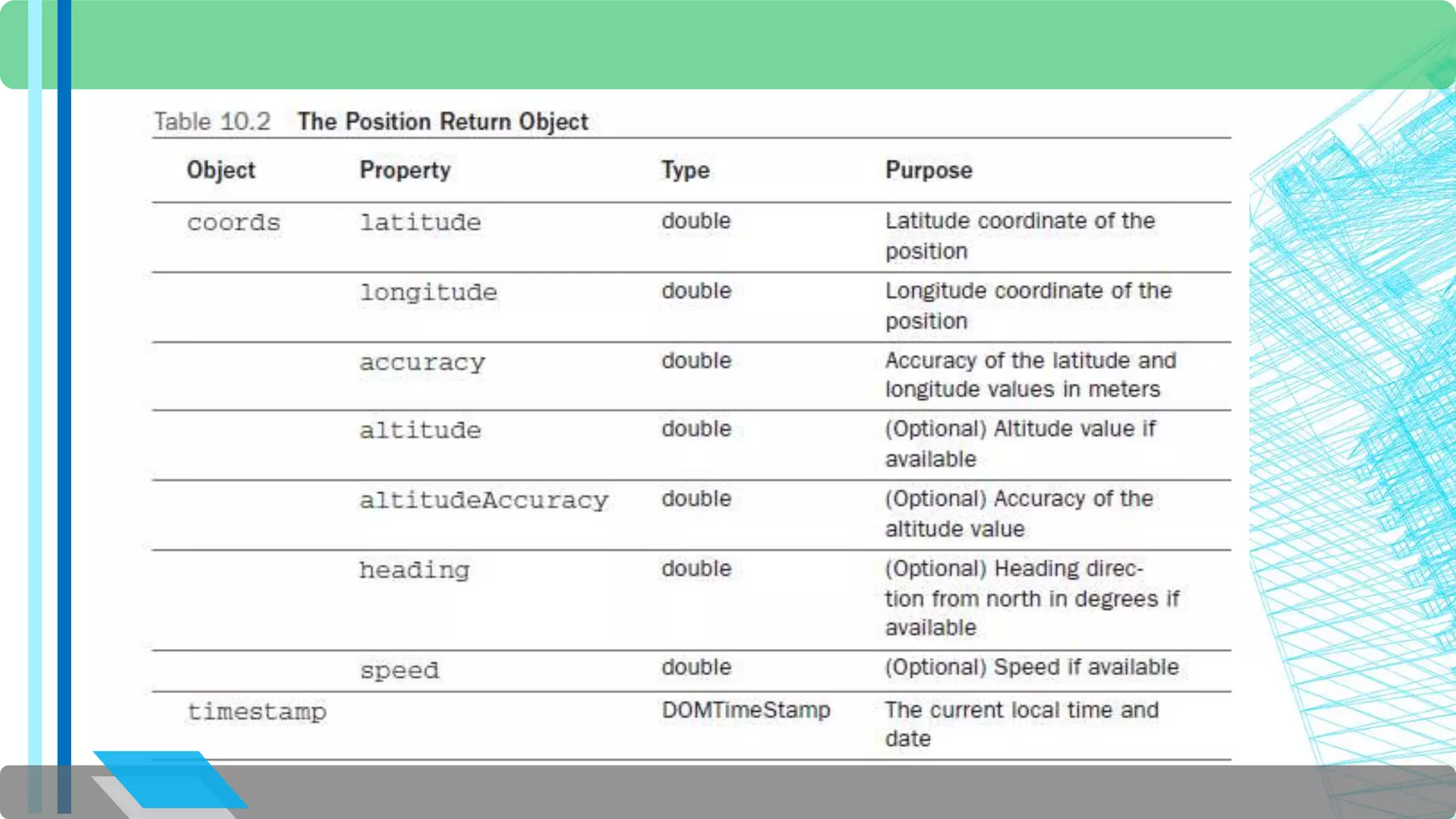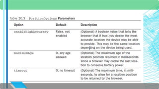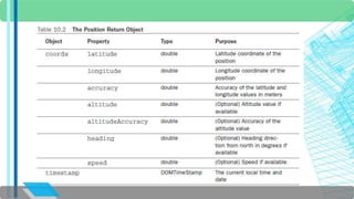 The document discusses the HTML5 Geolocation API. It provides an overview of how the API allows websites and applications to access a browser's location. It describes the API objects and methods for retrieving location information, including getCurrentPosition to get the current position and PositionOptions to control the location data returned. It includes examples of using getCurrentPosition to display the user's position on a map, handle errors if location is not provided, and calculate distance to other locations.