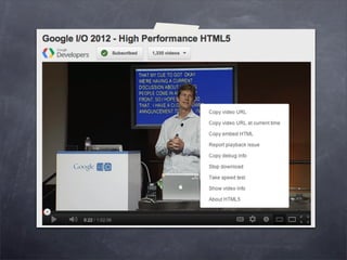 The document discusses the features and capabilities of HTML5. It covers new semantic elements, forms, offline storage, device access, multimedia, 3D graphics, performance improvements, and CSS3 features. Key points include more meaningful tags, custom data attributes, offline application caching, geolocation, cameras, web sockets, and canvas/WebGL for graphics.