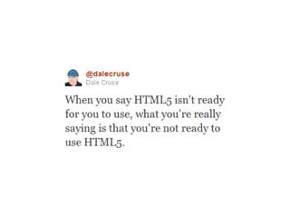 This document discusses HTML5 programming and several HTML5 features including multimedia, canvas, web sockets, web storage, indexed databases, offline capabilities, file systems, and geolocation. It provides examples and explanations of how to use these new HTML5 features in programming and notes that while specifications continue to evolve, real-world browser support is more important. It aims to cover programming aspects of video, canvas, web sockets, data storage, offline usage, file systems, and geolocation.