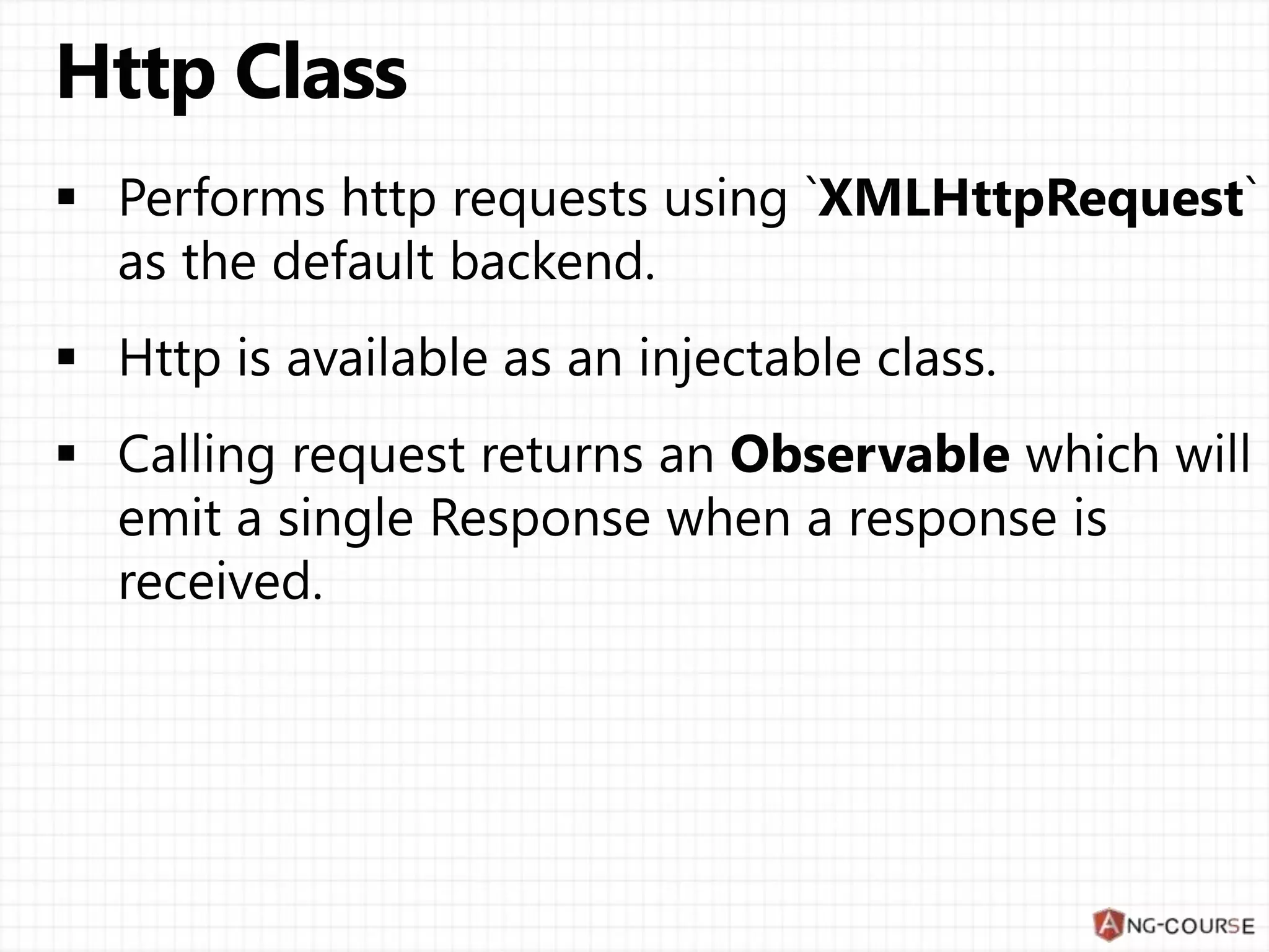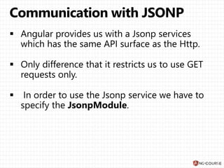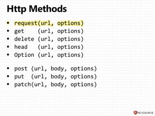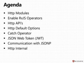 This document defines an Angular module that imports HttpModule and other modules. It declares AppComponent and exports AppModule class. It also defines a UserProxy service that uses Http client to make a GET request and return an Observable. It maps the response through several steps to return a list of users. It also shows how to add interceptors, headers, and handle errors for Http requests.