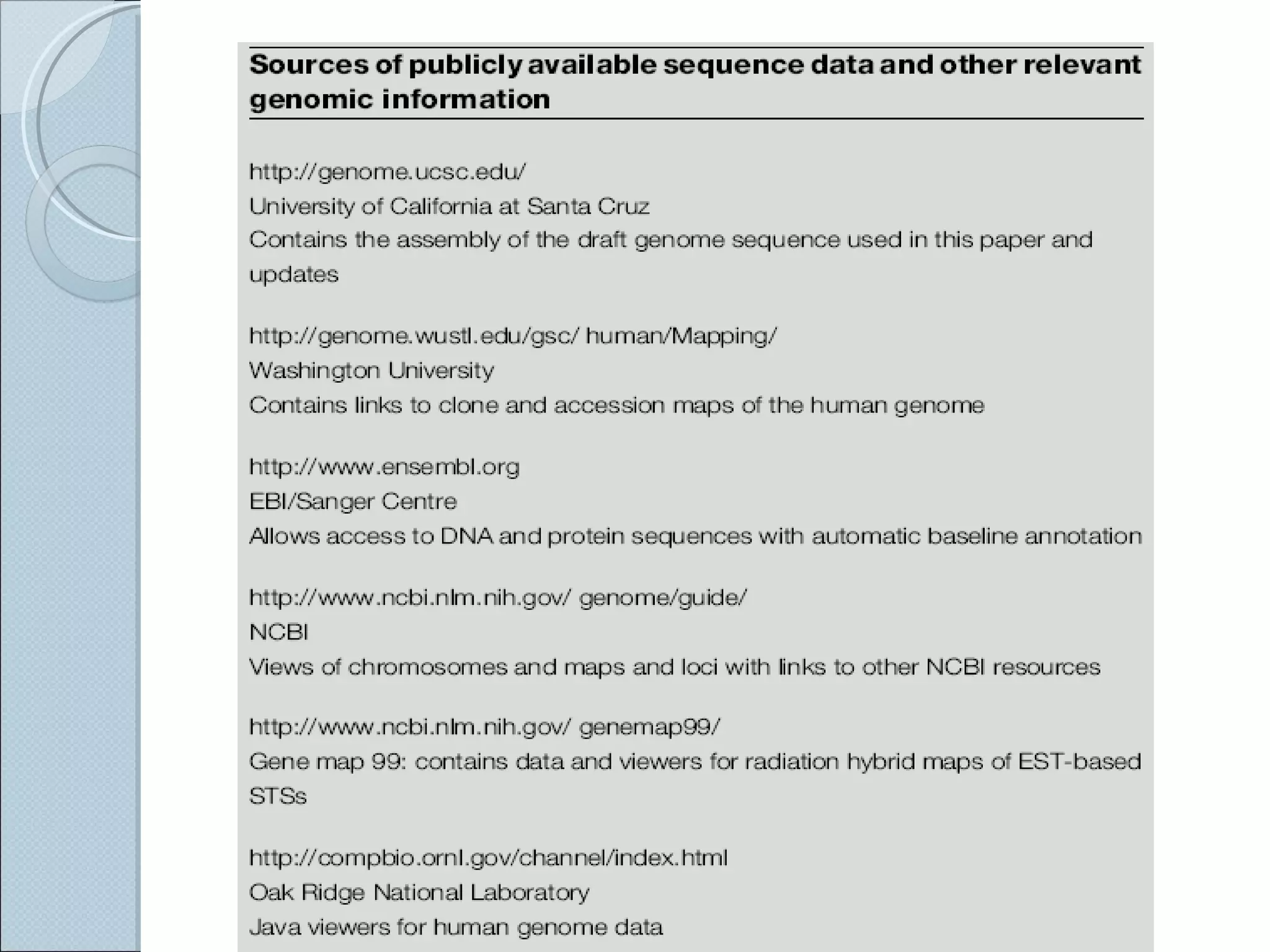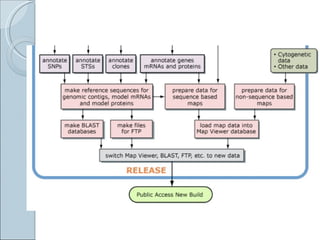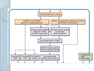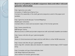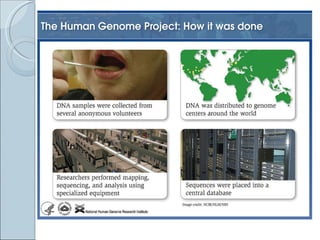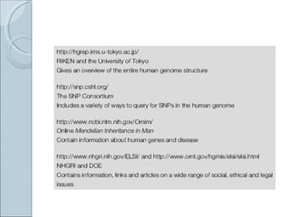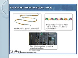 The document summarizes the Human Genome Project (HGP), which had the goals of identifying all human genes, determining the sequences of DNA base pairs that make up human DNA, storing this information in databases, and addressing ethical issues. Key milestones included completing a working draft in 2000 and fully sequencing the genome in 2003, two years ahead of schedule. The HGP and a private company collaborated to obtain the DNA sequence.