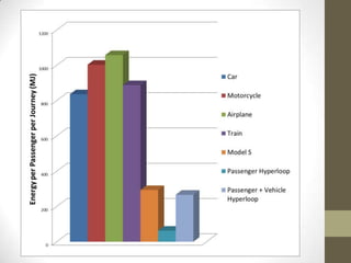 The document describes Elon Musk's concept for the Hyperloop, a proposed method of transportation that would allow travel between Los Angeles and San Francisco in just 35 minutes. The Hyperloop would use a low-pressure tube with capsules that accelerate to high speeds using magnetic acceleration and air bearings. It would be faster, cheaper, and more energy efficient than existing modes of transportation like airplanes and high-speed rail. Major technical challenges include ensuring stable levitation and handling acceleration forces within safe human tolerance limits.