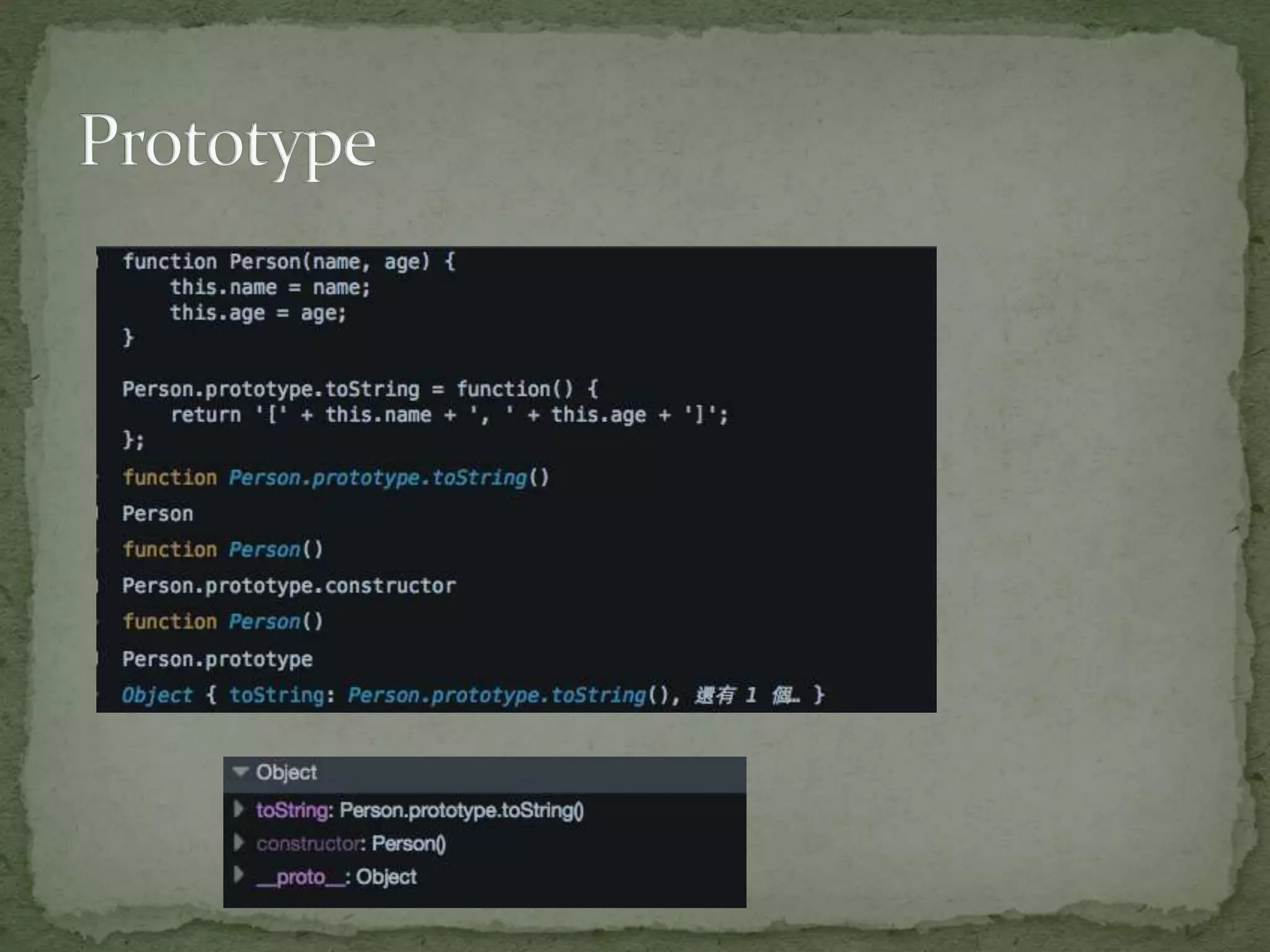 • #13 物件是以現有範例 (即原型) 物件的複本形式建立。此原型物件的任何屬性和方法,將視同從該原型建構函式所建立之物件的屬性和方法。您可以說這些物件是繼承其原型的屬性和方法。