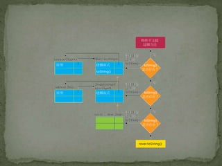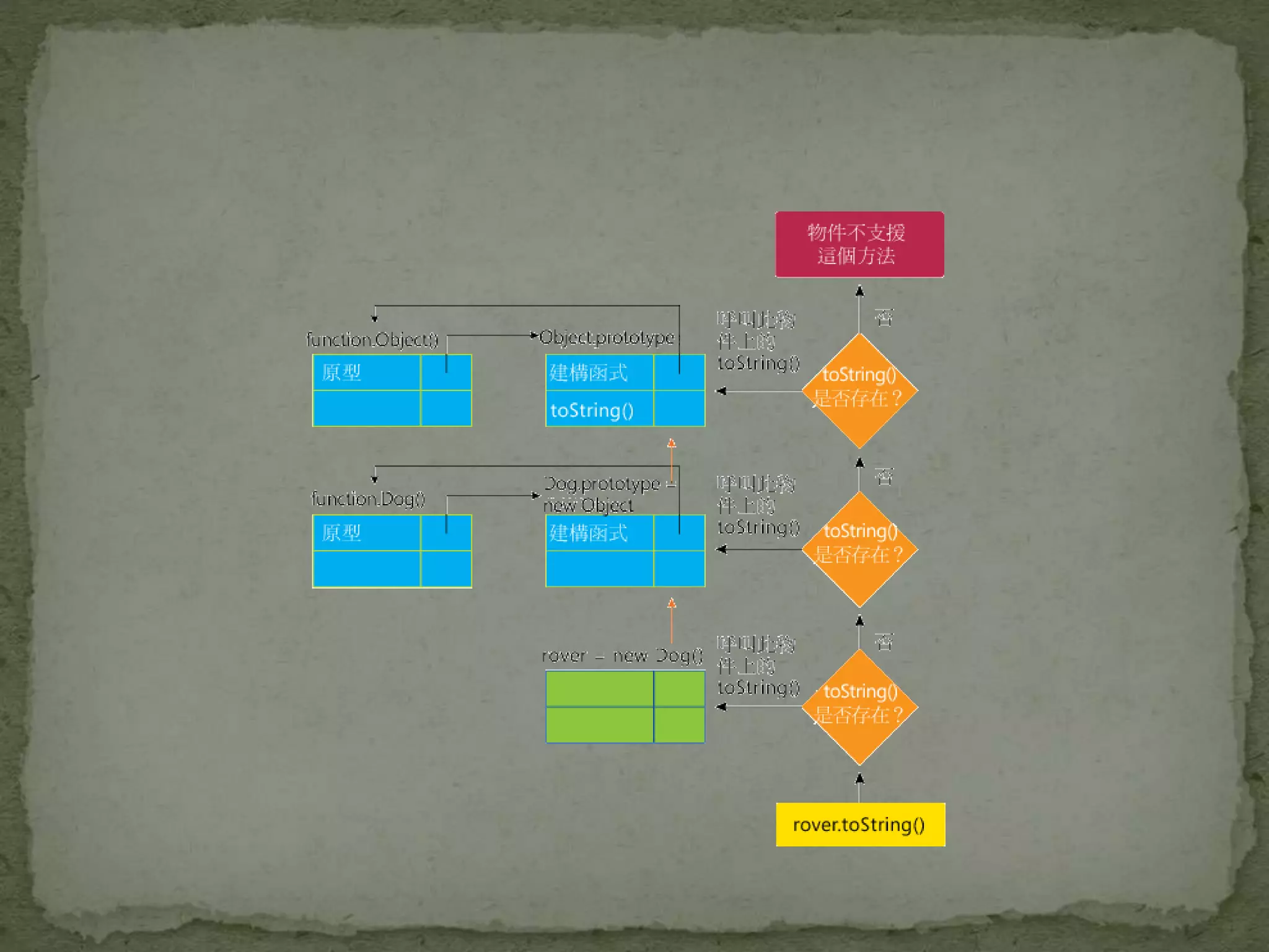 • #17 當您嘗試存取物件的屬性/方法時,JavaScript 會檢查該屬性/方法是否定義在物件中。如果沒有,就會檢查該物件的原型。如果還是沒有,則會檢查該物件原型的原型,以此類推,直到 Object.prototype 為止。 您可以在 Dog.prototype 中定義 toString 方法,來覆寫 Object.prototype 的 toString 方法。