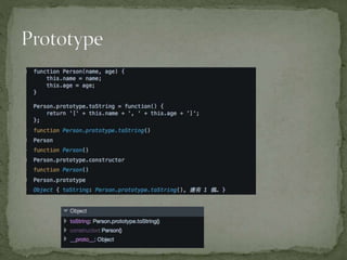 • #16 在 JavaScript 中,每一個函數都有一個叫做 "prototype" 的屬性,此屬性會參考原型物件。原型物件則有一個叫做 "constructor" 的屬性,這會回頭參考函數本身。這是一種循環參考