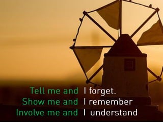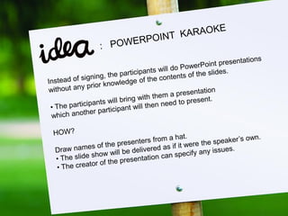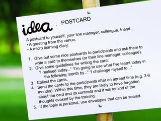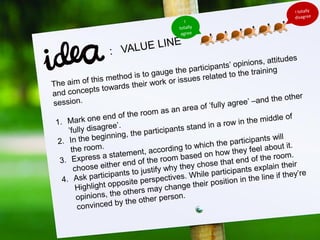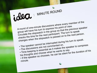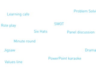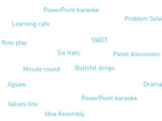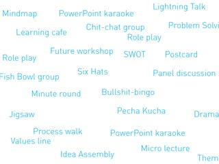 This document summarizes a workshop on learning methods. The workshop aimed to expose participants to three learning methods in one hour, teach new ways to activate learners, and activate participants to learn new methods in the future. It provided warming exercises, discussed various learning methods, had participants reflect on their own learning styles, and reflected on learning at the end. Graphics and exercises were used to engage participants in learning about idea generation and analysis methods. The best method is considered whichever suits one's own strengths and making the most of diversity.