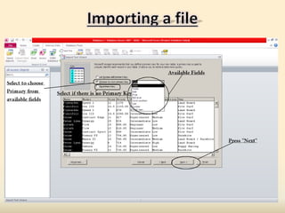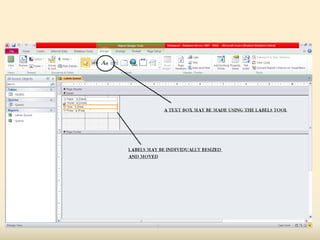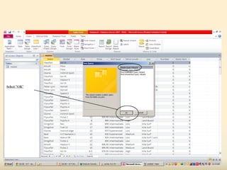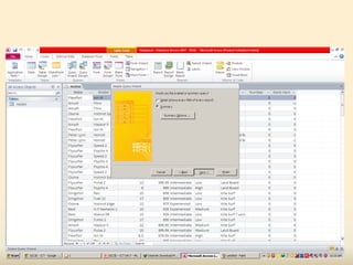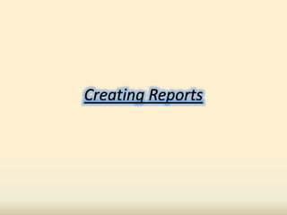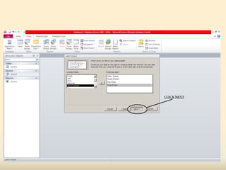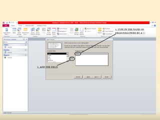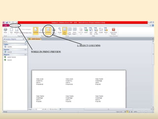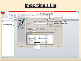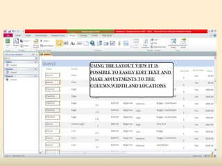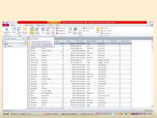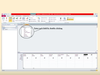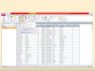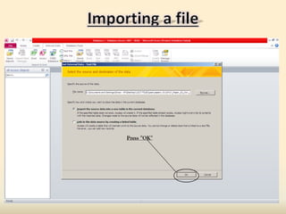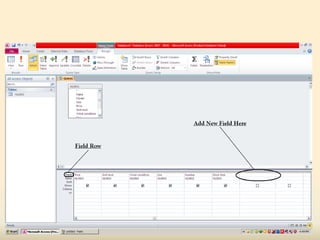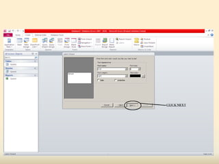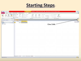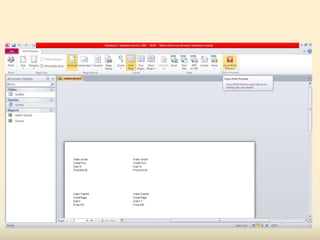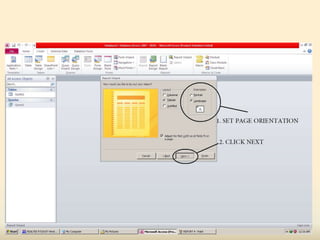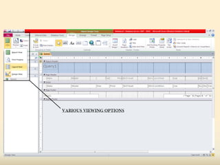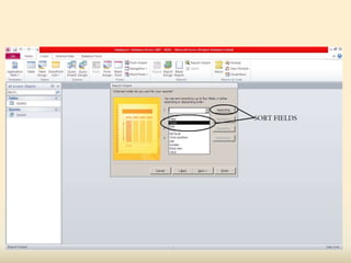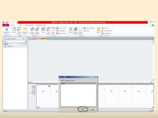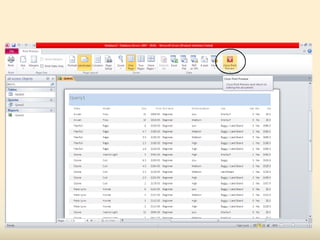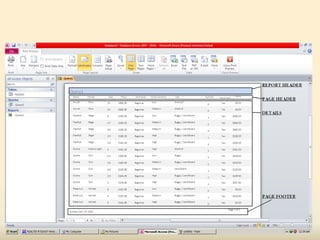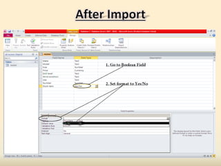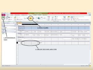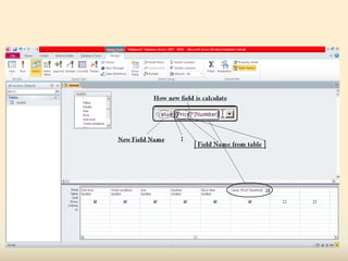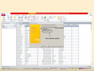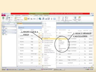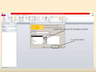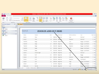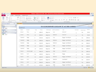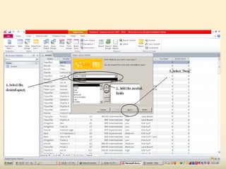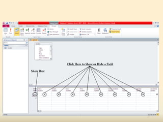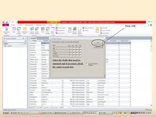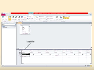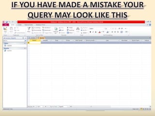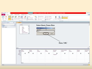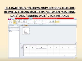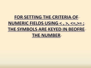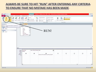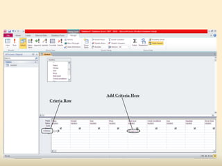 The document provides instructions for setting criteria queries in MS Access to filter records based on specific keywords. It explains how to show records containing a word, not containing it, starting with, ending with, or containing it anywhere by using specific formats in the criteria row. These query techniques help users refine search results effectively.