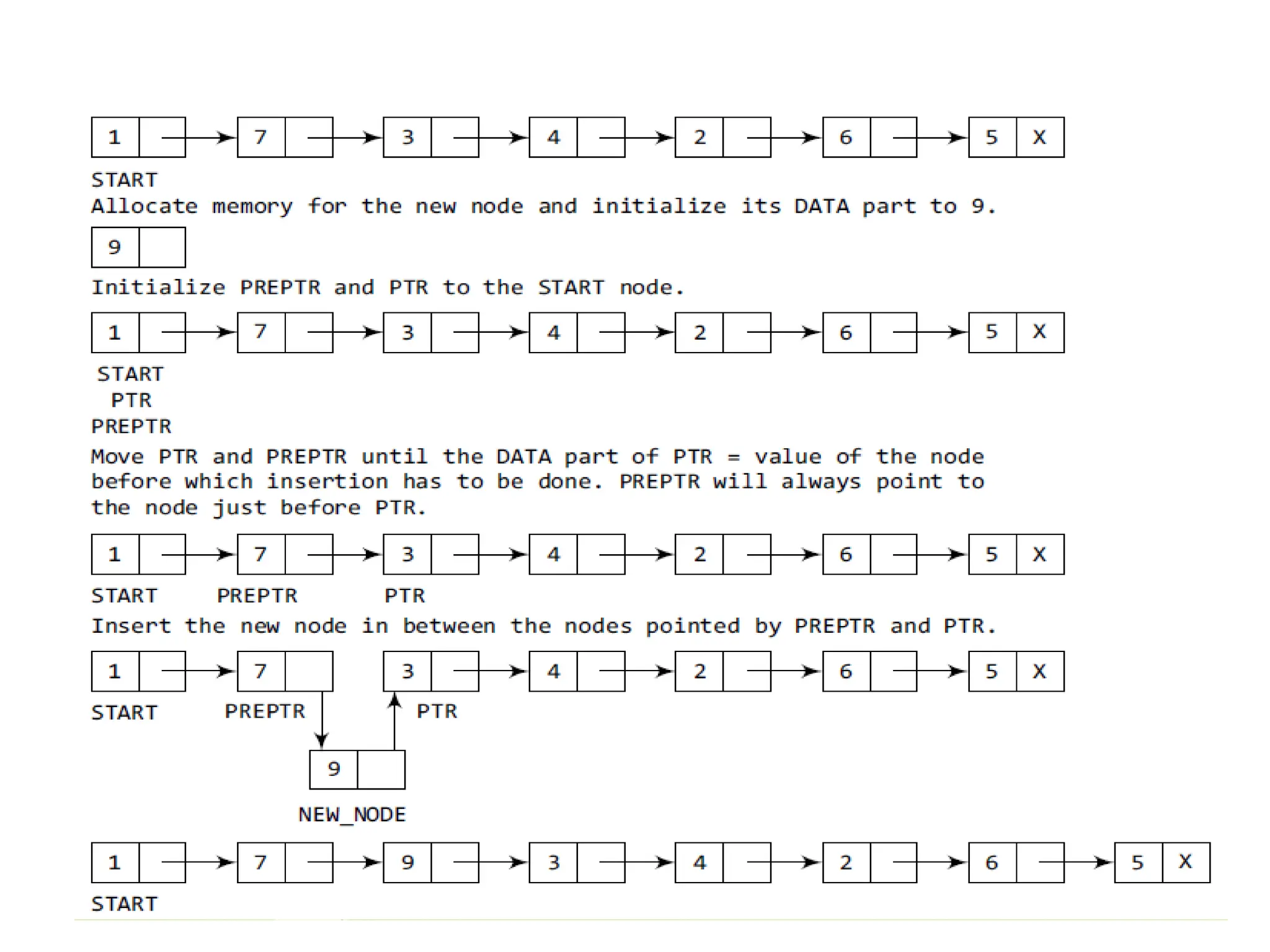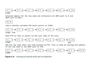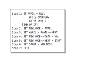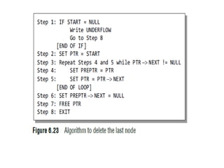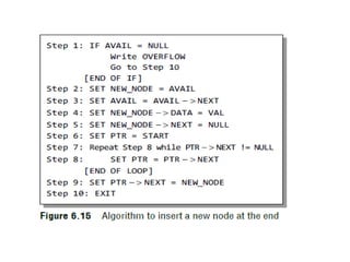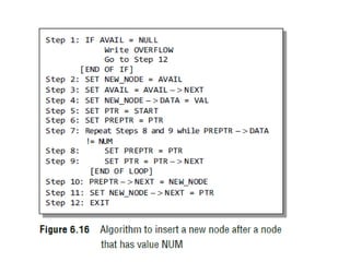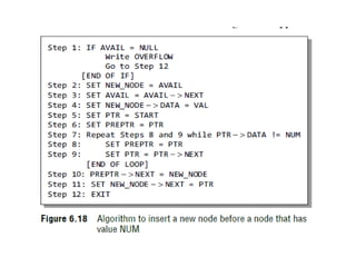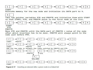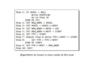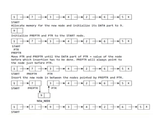 The document provides an overview of linked lists, describing their structure, types (singly linked, doubly linked, and circular linked), and various operations such as creation, traversal, insertion, and deletion of nodes. Each node in these lists contains data and links to other nodes, with specific procedures outlined for manipulating these lists. Additionally, algorithms for searching, inserting, and deleting nodes in both standard and circular linked lists are detailed.