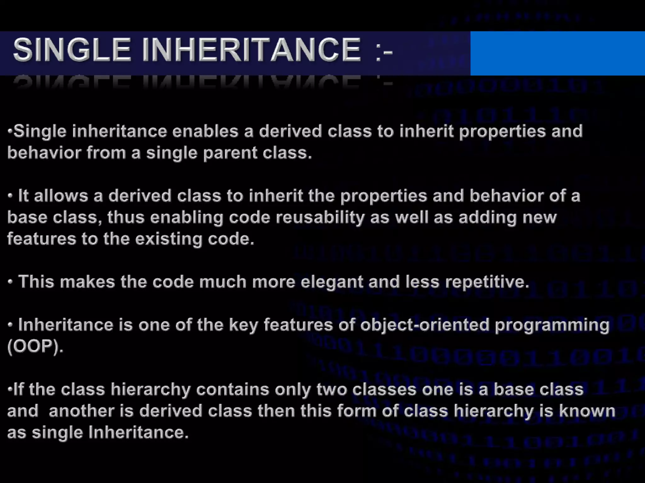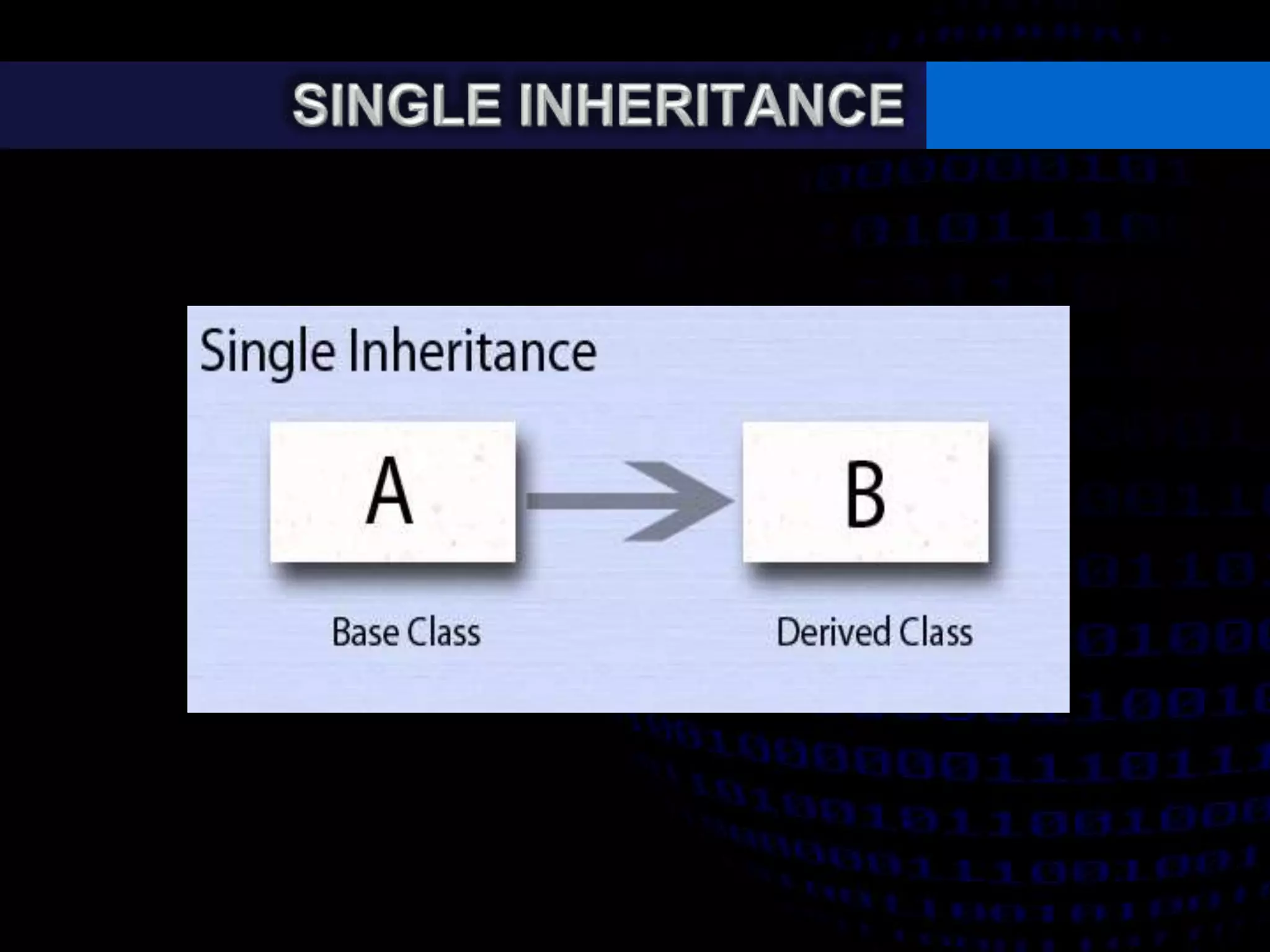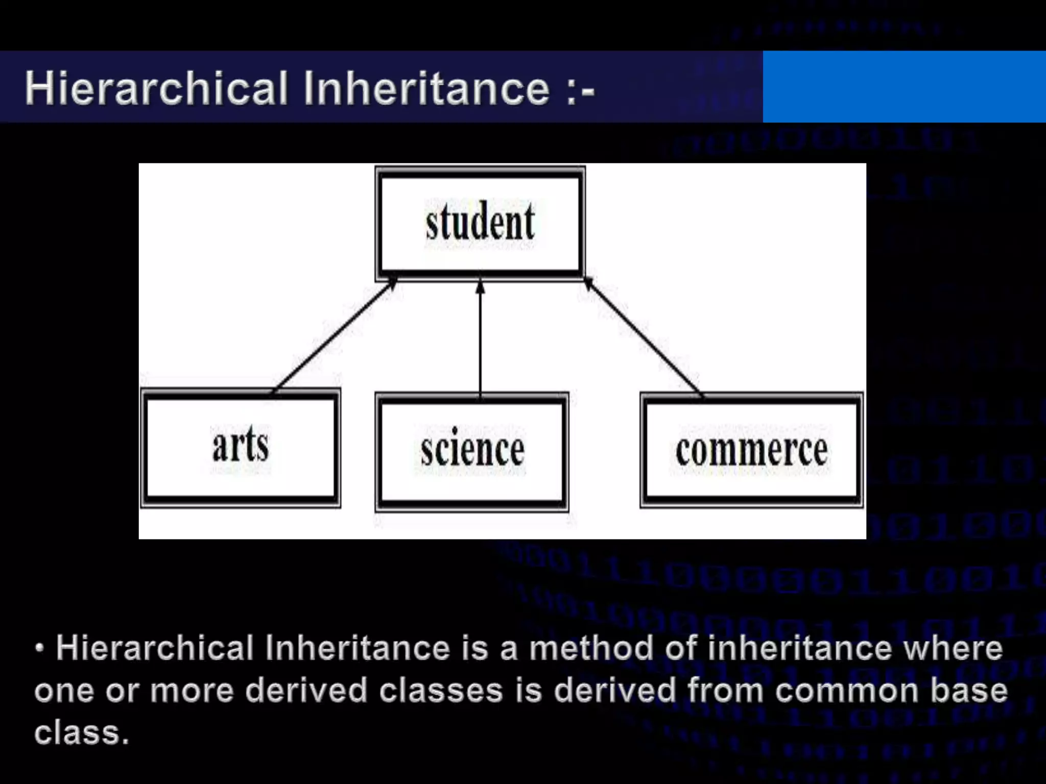 - Single, multilevel, multiple, hierarchical, and hybrid inheritance structures