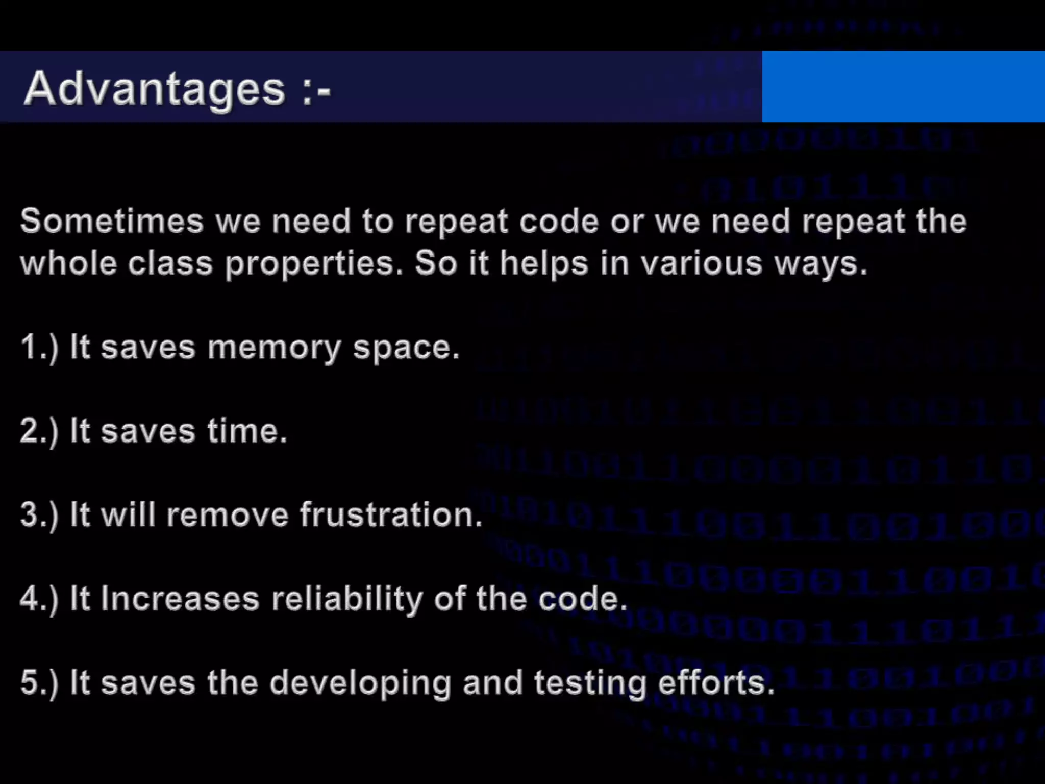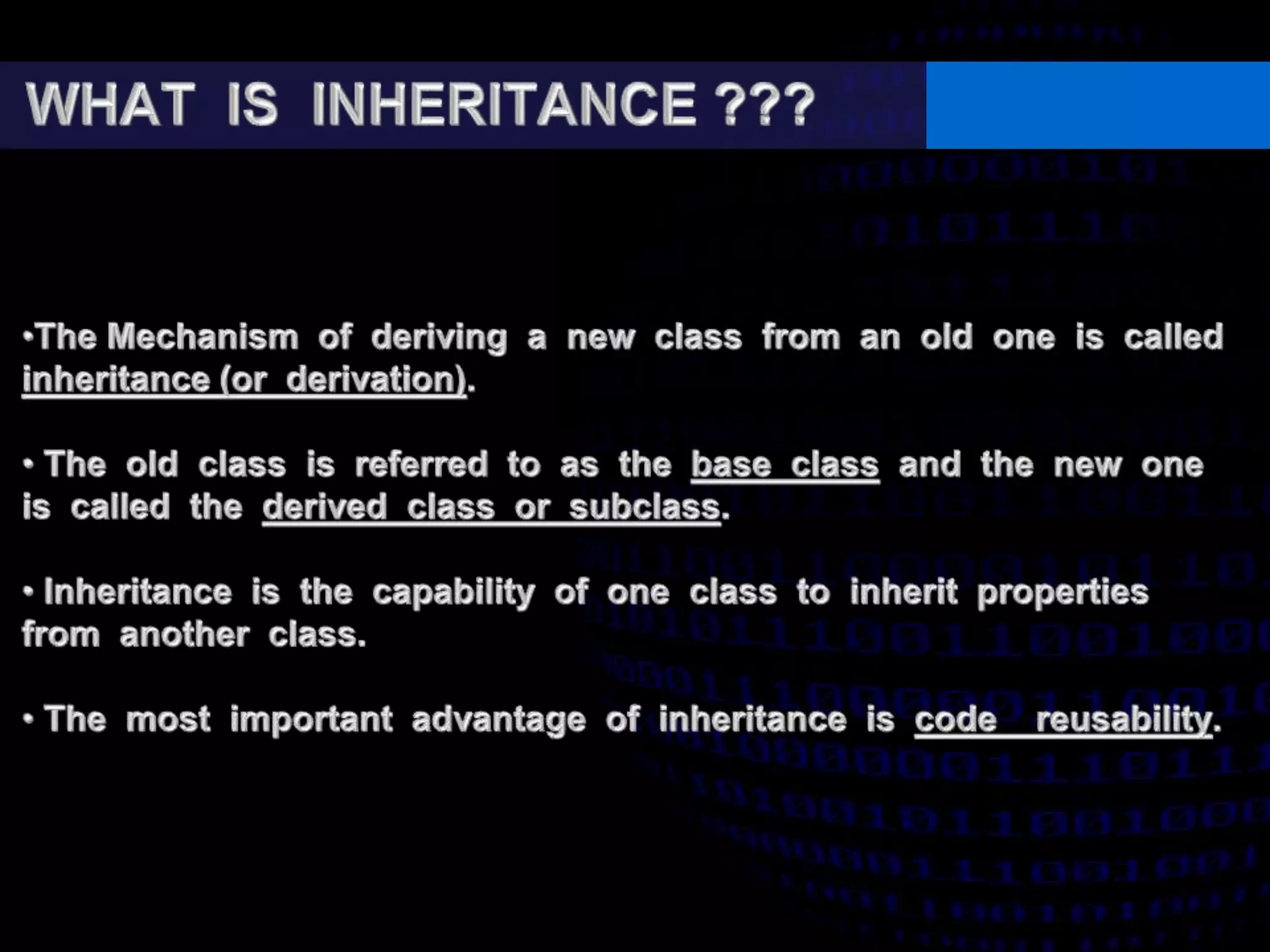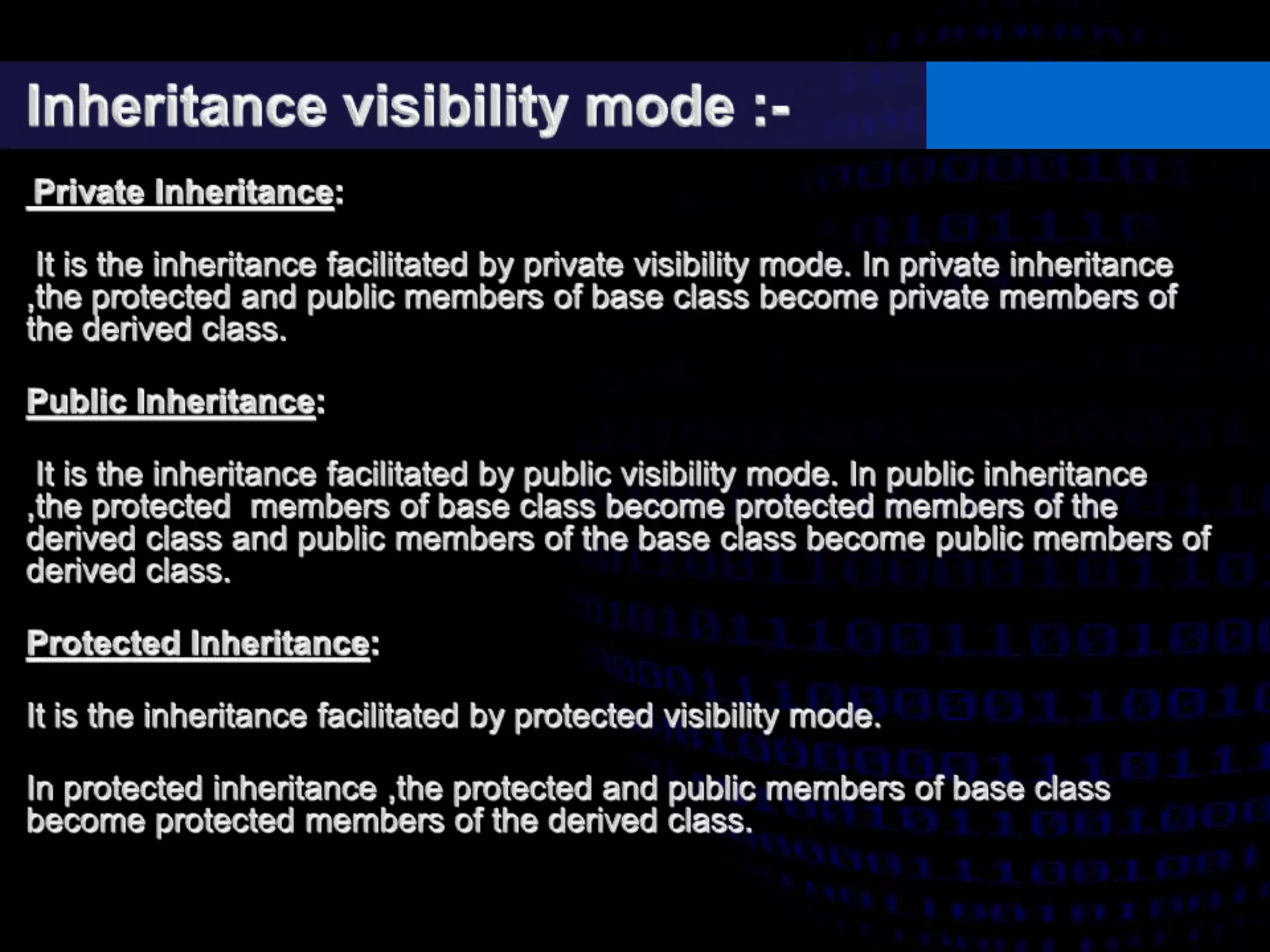- Single, multilevel, multiple, hierarchical, and hybrid inheritance structures