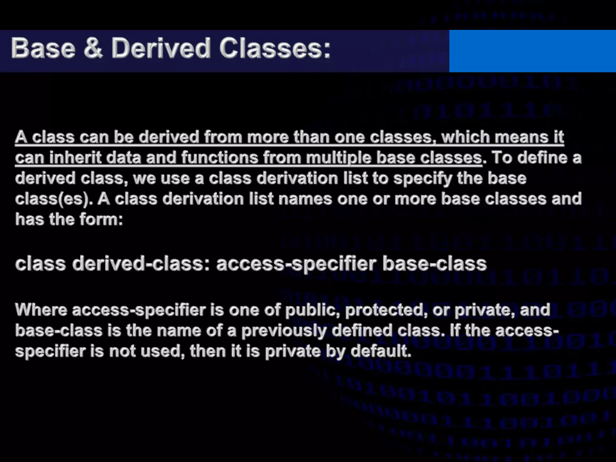 - Access specifiers for base and derived classes and their effects