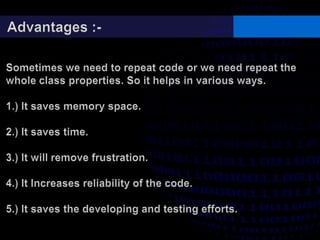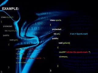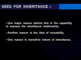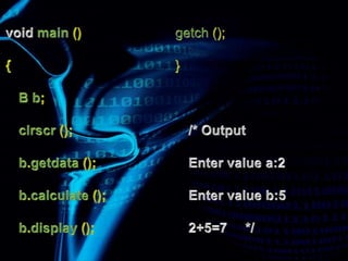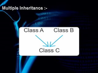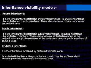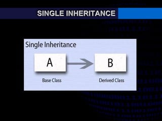 This document discusses types of inheritance in object-oriented programming including single, multilevel, multiple, hierarchical, and hybrid inheritance. It provides code examples and explanations of:
