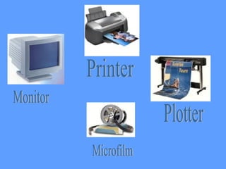 Input devices such as keyboards, mice, scanners, and bar code readers allow data and instructions to be entered into a computer. Output devices like monitors, printers, plotters, and microfilm allow the computer to present information externally. Common input devices include keyboards for text entry, mice for cursor control, joysticks as alternatives to mice, scanners for digitizing documents, and bar code readers for identifying products. Common output devices are monitors for visual display, printers for hard copies, and plotters for technical drawings. Together, input and output devices facilitate interaction between users and computers.