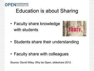 This document provides an overview of open licenses and intellectual property presented by Kathleen Omollo on May 14, 2014. It discusses how open licenses allow legal sharing and remixing of content through options like Creative Commons that allow attribution, non-commercial use, and sharing alike. The presentation promotes adopting open educational resources to expand access to education and support teaching and learning. It explains key concepts like copyright and public domain, and how open licenses maintain some rights while allowing propagation of content through copies, derivatives and other transformations.