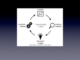 The document discusses interactive data visualization techniques using d3.js, referencing Shneiderman's visual analysis principles. It emphasizes a structured approach to visualizing data through methods such as filtering, sorting, and zooming, along with various examples and resources for learning d3.js. Additionally, it provides links to tools, tutorials, and community events for further engagement in data visualization practices.