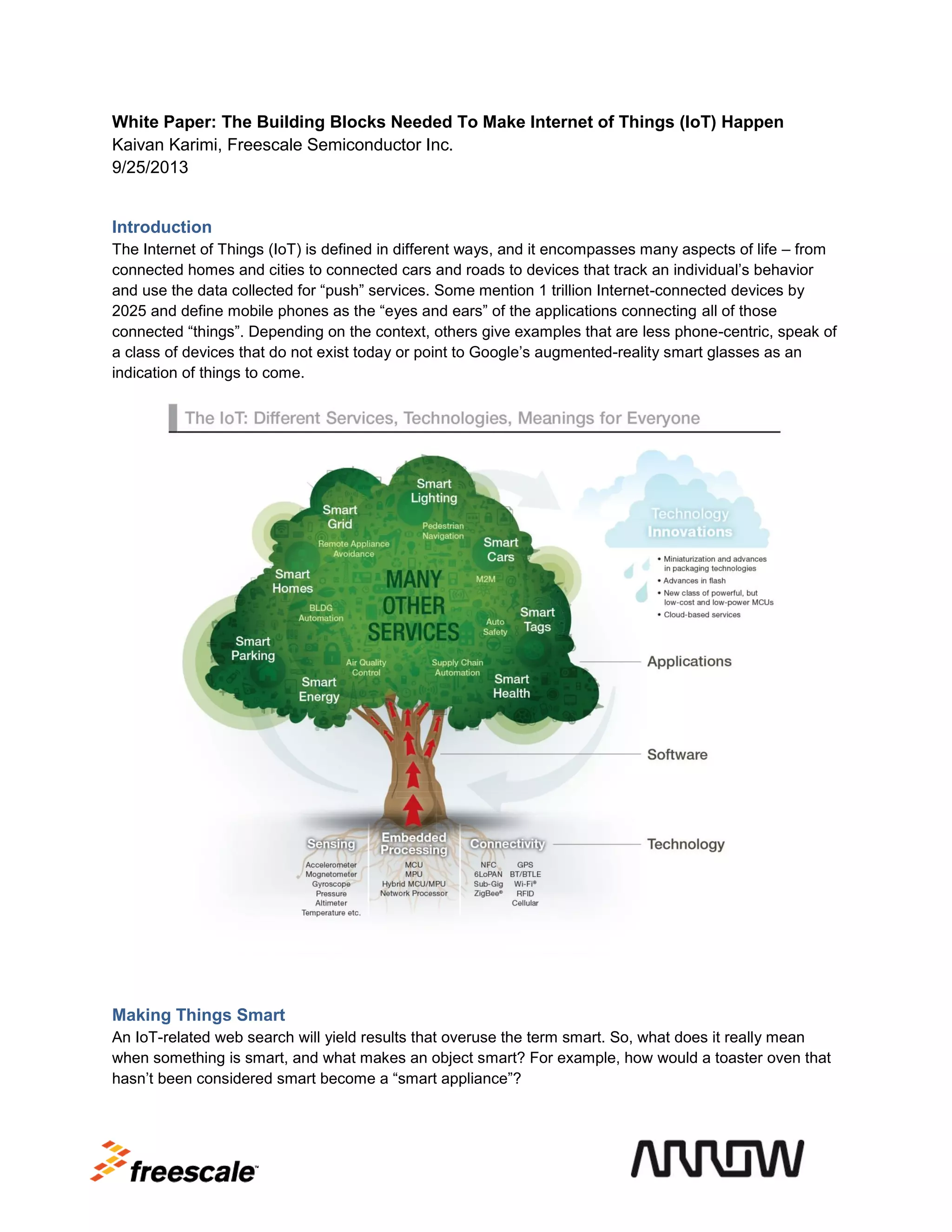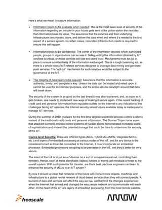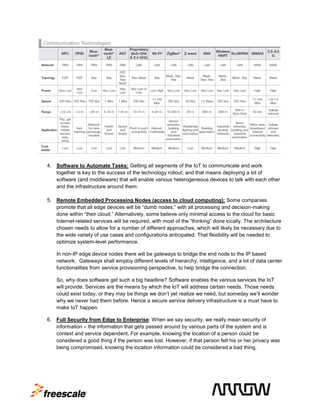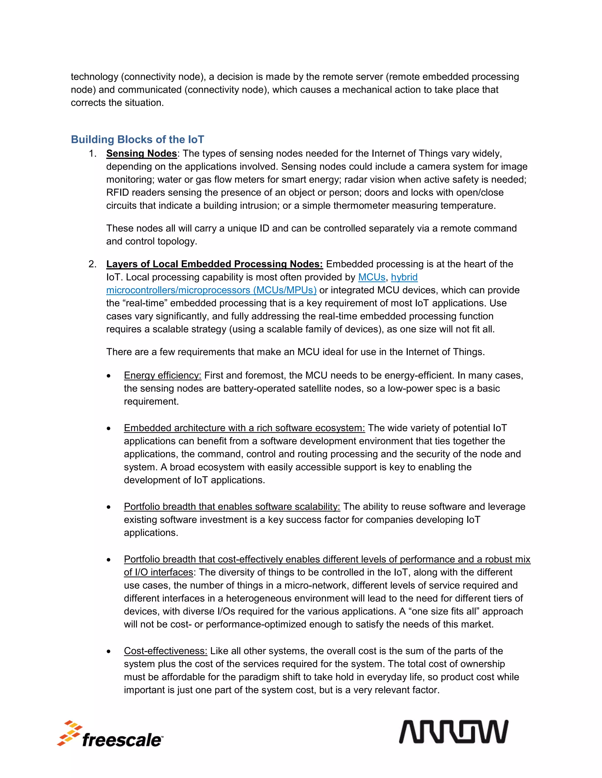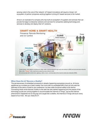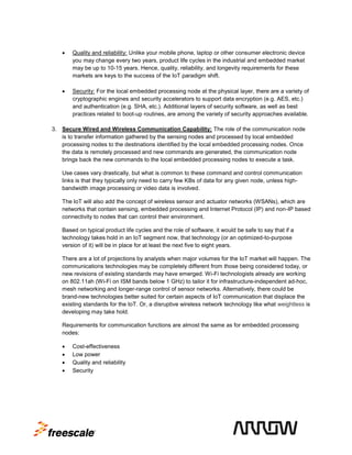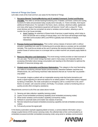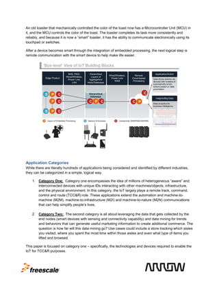 This document discusses the key building blocks needed to enable the Internet of Things (IoT). It outlines four main categories of IoT applications: 1) remote tracking/monitoring and control, 2) process control and optimization, 3) resource allocation and optimization, and 4) context-aware automation and decision making. The main building blocks are then described in more detail: 1) sensing nodes to collect data, 2) local embedded processing nodes to analyze the data, 3) connectivity nodes to communicate wired or wirelessly, 4) software to automate tasks, and 5) remote processing nodes in the cloud. Microcontroller units are discussed as ideal local processing nodes due to requirements for energy efficiency, software ecosystems, cost effectiveness, quality,