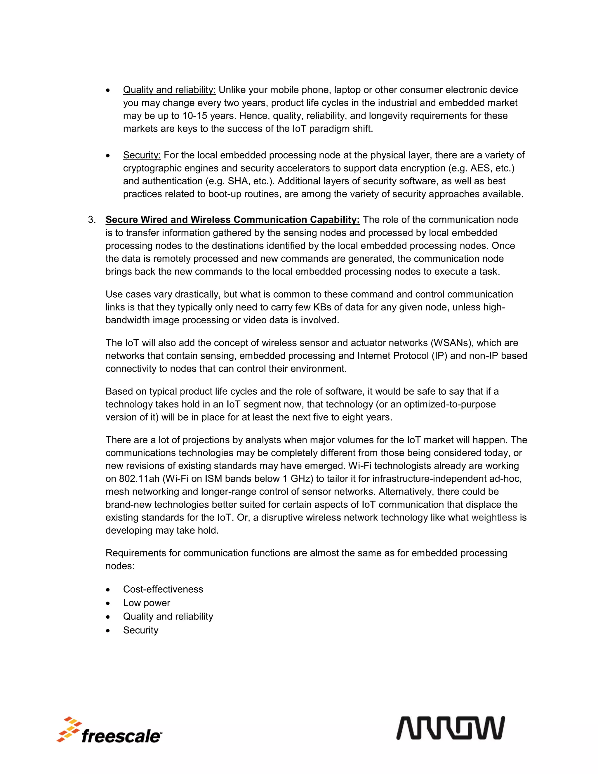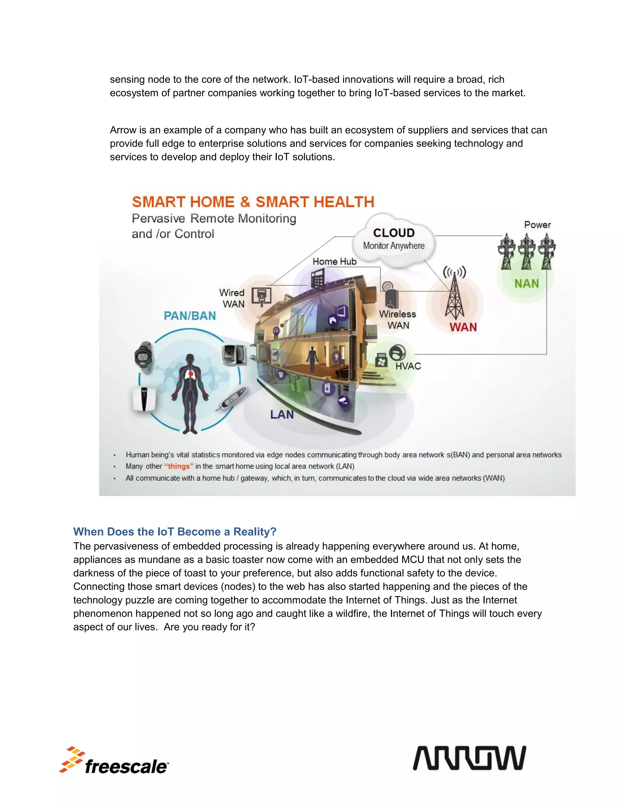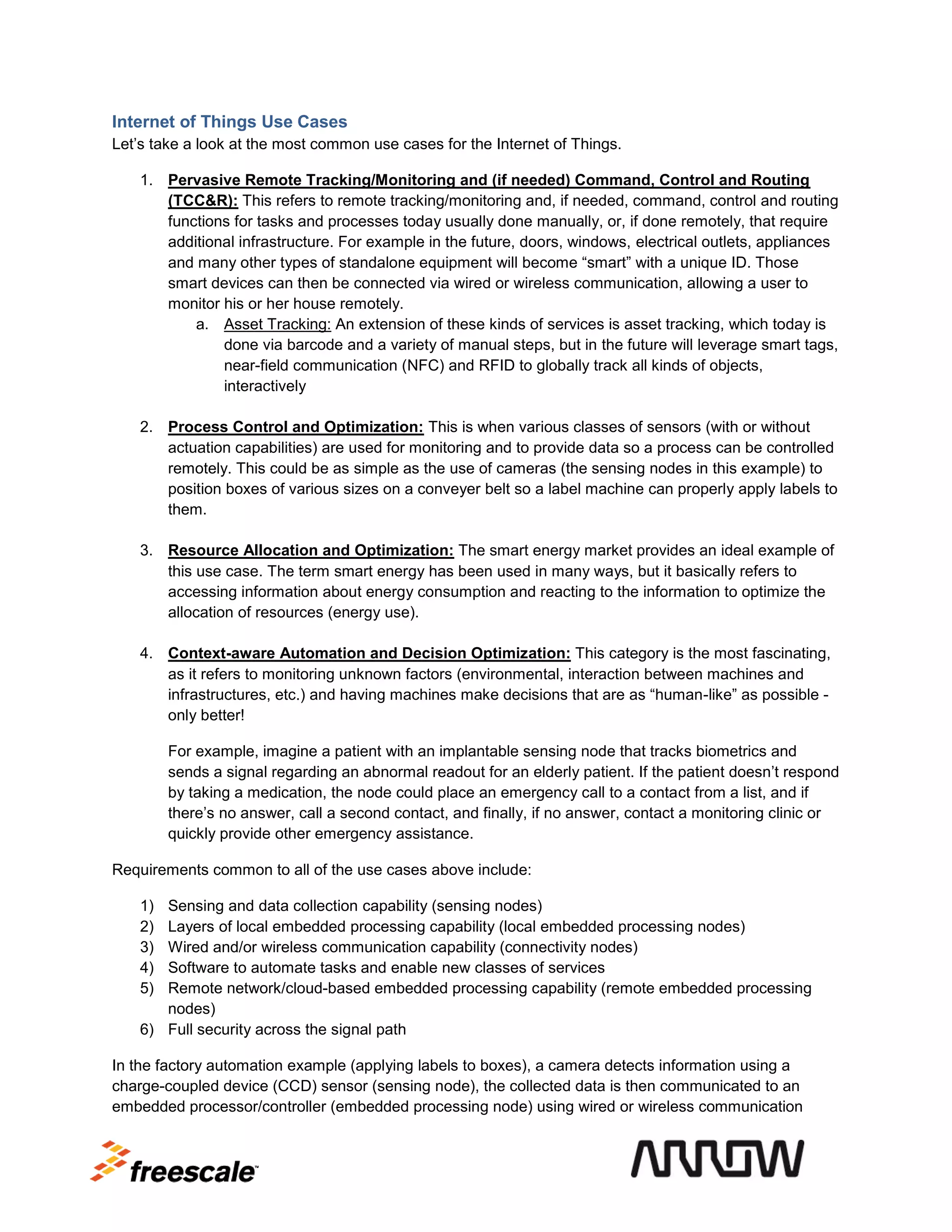 This document discusses the key building blocks needed to enable the Internet of Things (IoT). It outlines four main categories of IoT applications: 1) remote tracking/monitoring and control, 2) process control and optimization, 3) resource allocation and optimization, and 4) context-aware automation and decision making. The main building blocks are then described in more detail: 1) sensing nodes to collect data, 2) local embedded processing nodes to analyze the data, 3) connectivity nodes to communicate wired or wirelessly, 4) software to automate tasks, and 5) remote processing nodes in the cloud. Microcontroller units are discussed as ideal local processing nodes due to requirements for energy efficiency, software ecosystems, cost effectiveness, quality,