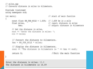 The document provides an introduction to programming in C++, detailing the software development cycle, essential components of a program, and key features of object-oriented programming. It covers basic program structures, data types, variables, input/output operations, operators, and expressions alongside common programming conventions. Additionally, it highlights the evolution of C++ and its syntax, including examples of algorithms and code implementation.