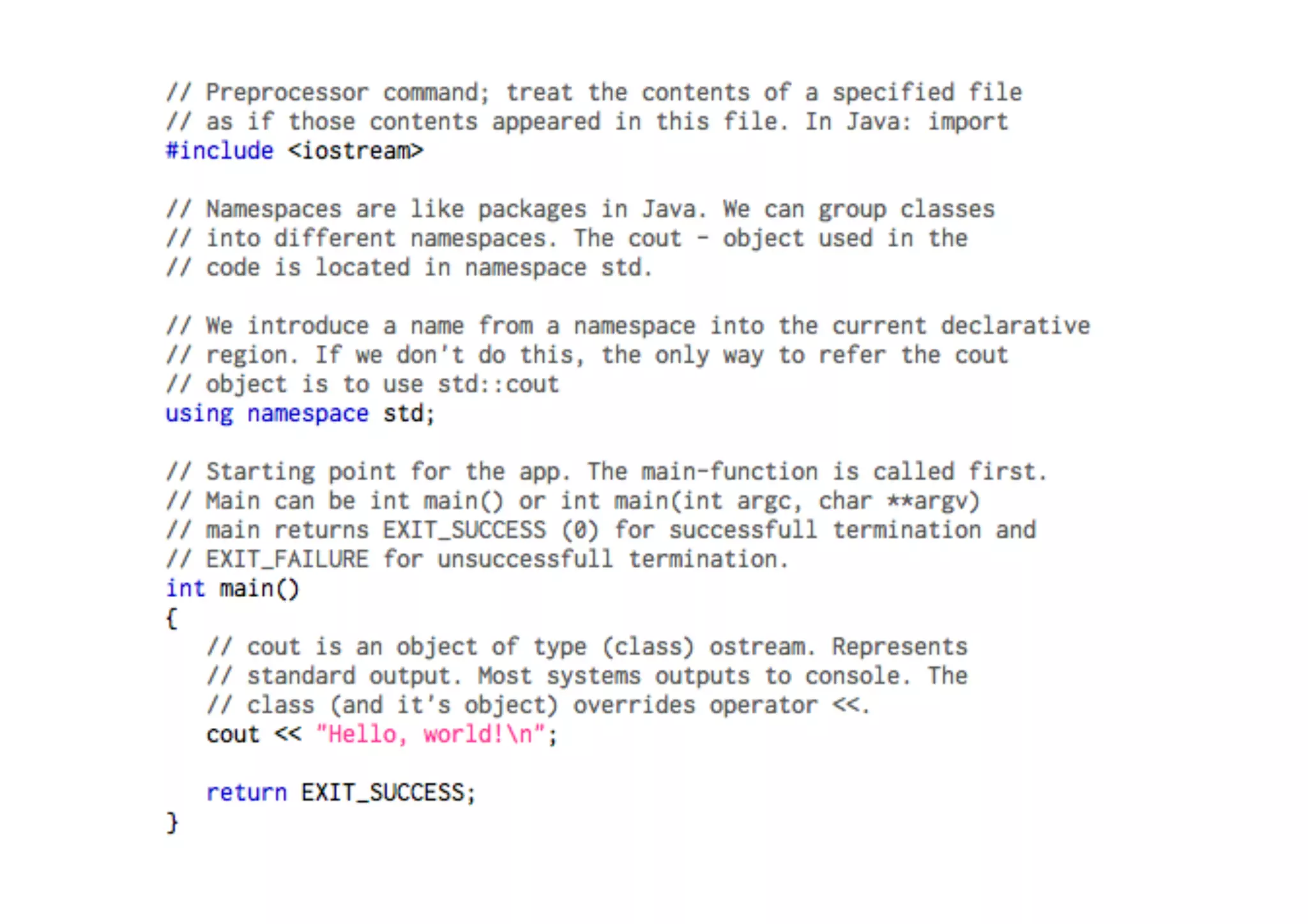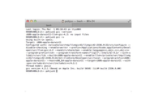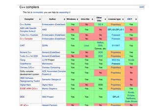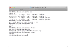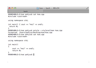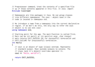 This document provides an introduction to C++ for Java developers. It discusses the C++ standard and standard library, which includes containers, strings, input/output streams, and other functionality. It also covers installing compilers like GCC, compiling and running simple C++ programs, code style, using Makefiles, and includes examples of basic C++ syntax like output, input, datatypes, and strings.