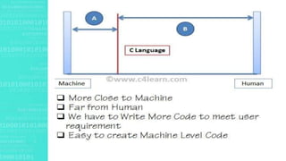 The document provides an introduction to the C programming language. It discusses the history of C, describing how it was developed from the B language in the 1960s-1970s. C acts as a middle-level language that bridges machine-level and high-level languages. It is easy to learn, produces efficient programs, and can handle both low-level and application programming. The document also gives examples of basic C program elements like functions, variables, comments, and provides a simple "Hello World" program to demonstrate these elements.