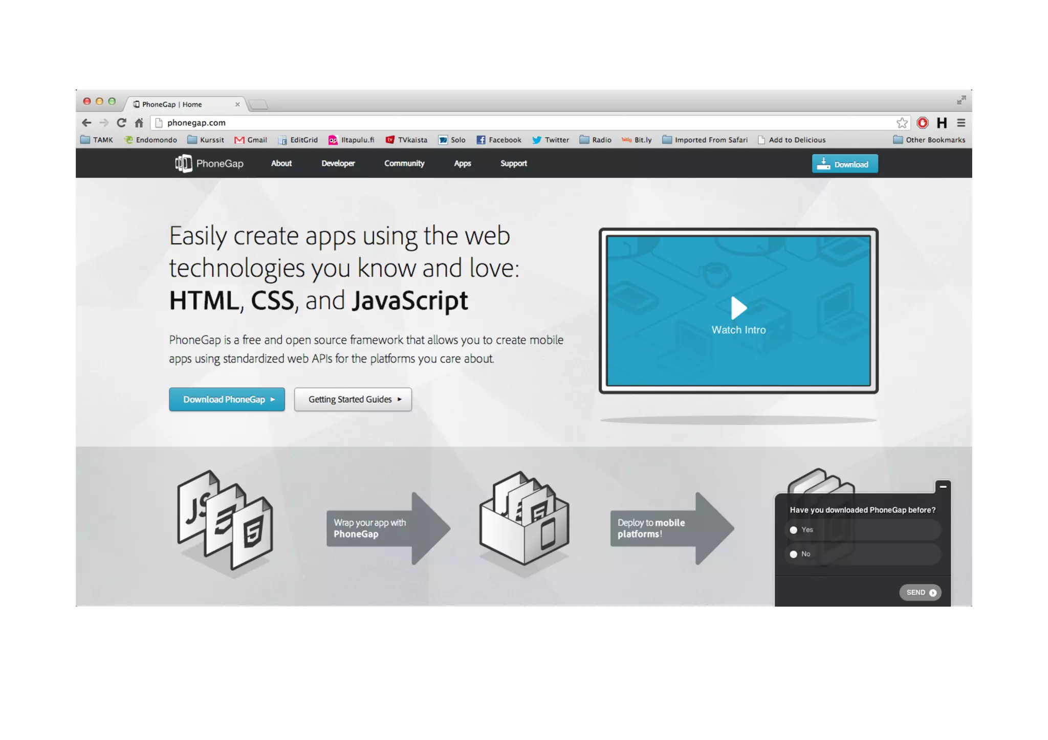 HTML5   •  Fi#h  version  of  HTML  standard  by  W3C   •  SCll  under  development  but  lot  of  browsers   support  the  proposal  of  the  standard   •  Simple  markup  that  can  be  wriFen  either  in   HTML  or  XHTML  syntax   •  PotenCal  candidate  for  cross  pla0orm  mobile   apps