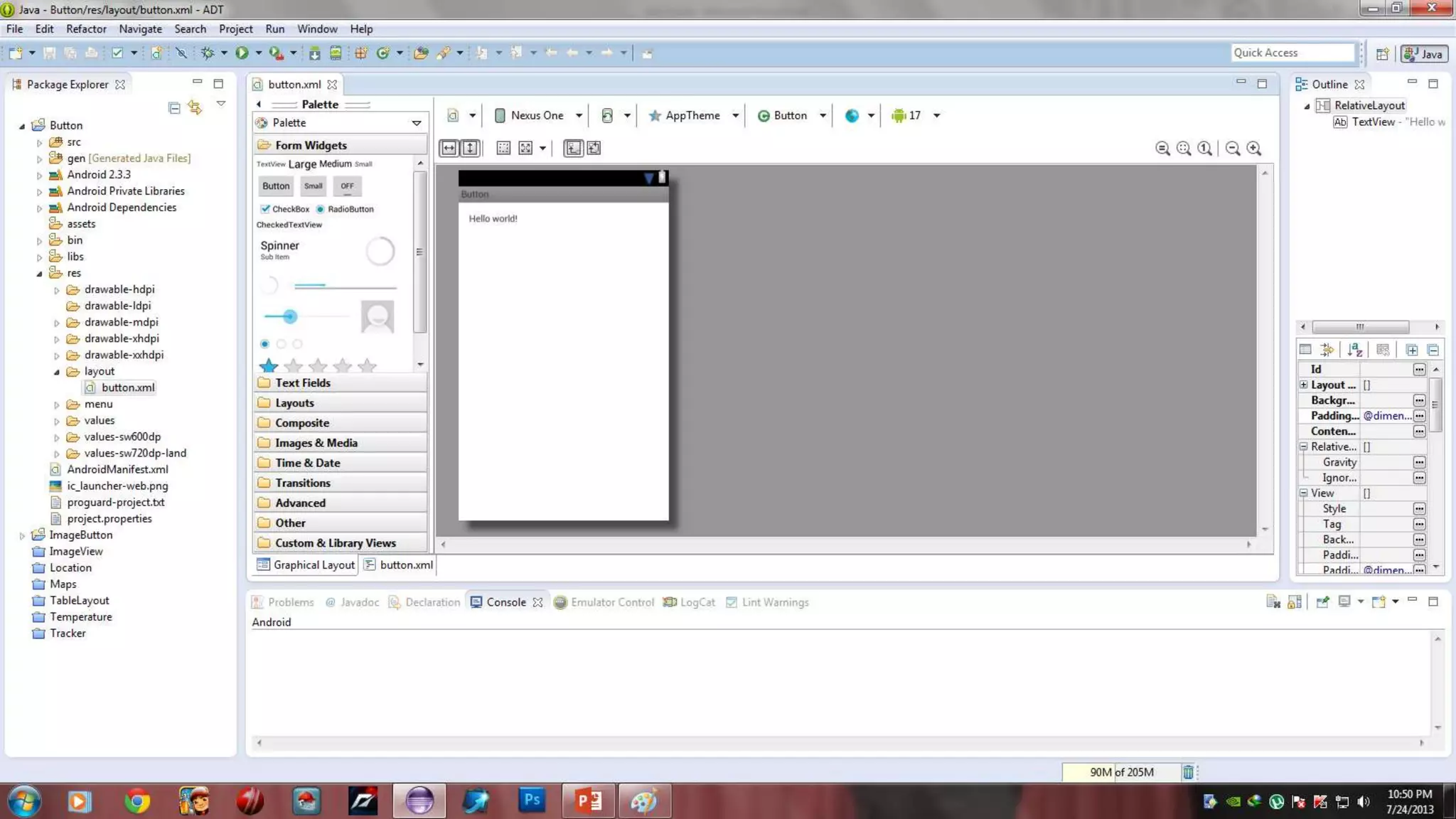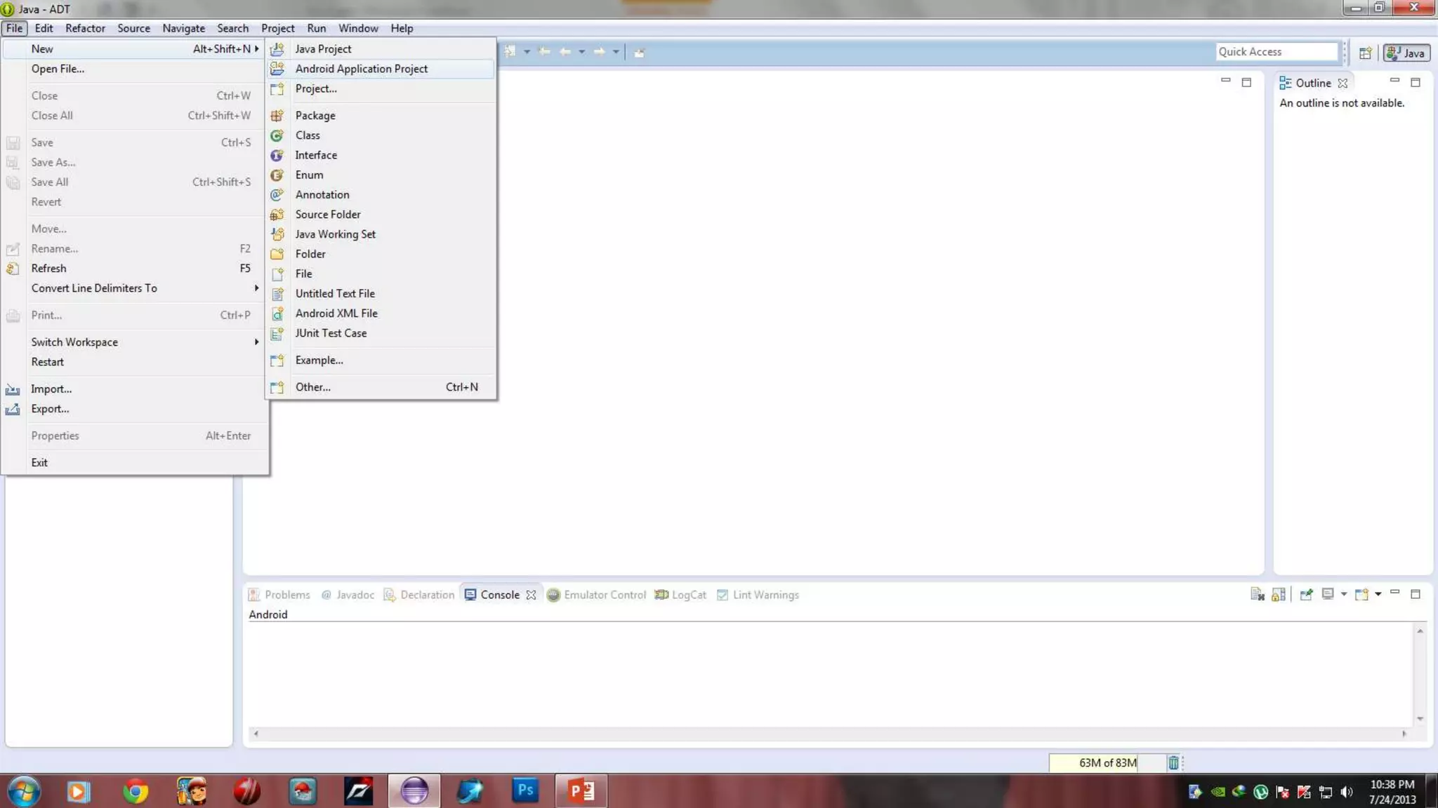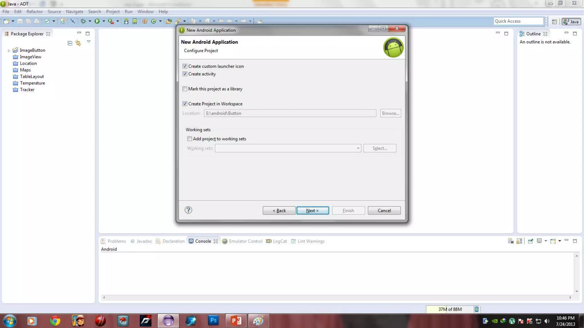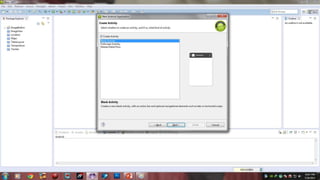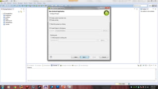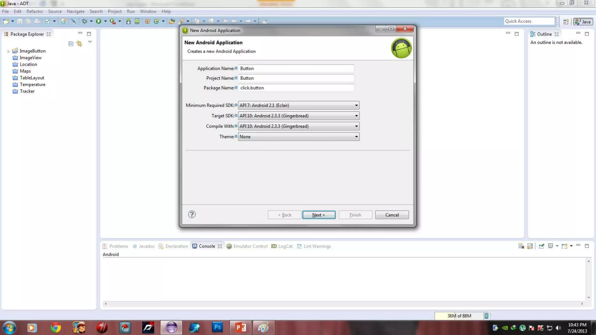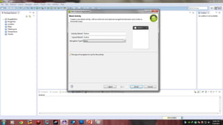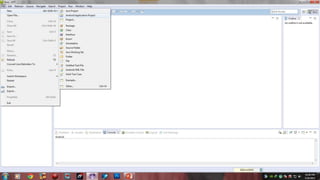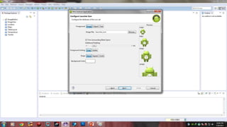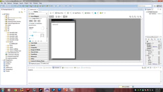 Steps for creatinga new Android project • Go to New->Android Application Project. • Application name must always start with a capital letter. • Package name can be any of your kind. Ex: com.view, button.click • Keep minimum SDK as API 7 • Target SDK is as your wish but it is better to maintain lower end platforms like API 8, API 10. • Click None for theme option if API level < 11. • Click Next until Activity Name prompts • You can give your desired name for Activity • The name given for layout will be the file name for .xml file • Click on Finish and your project is created