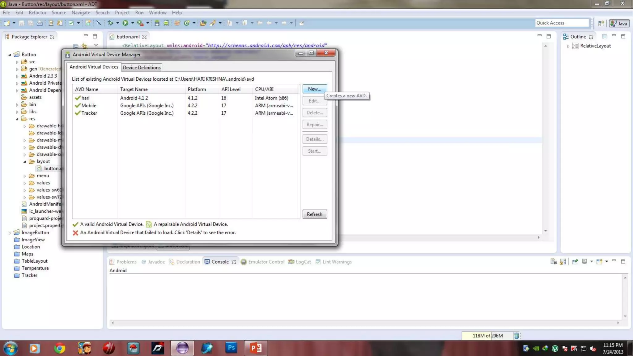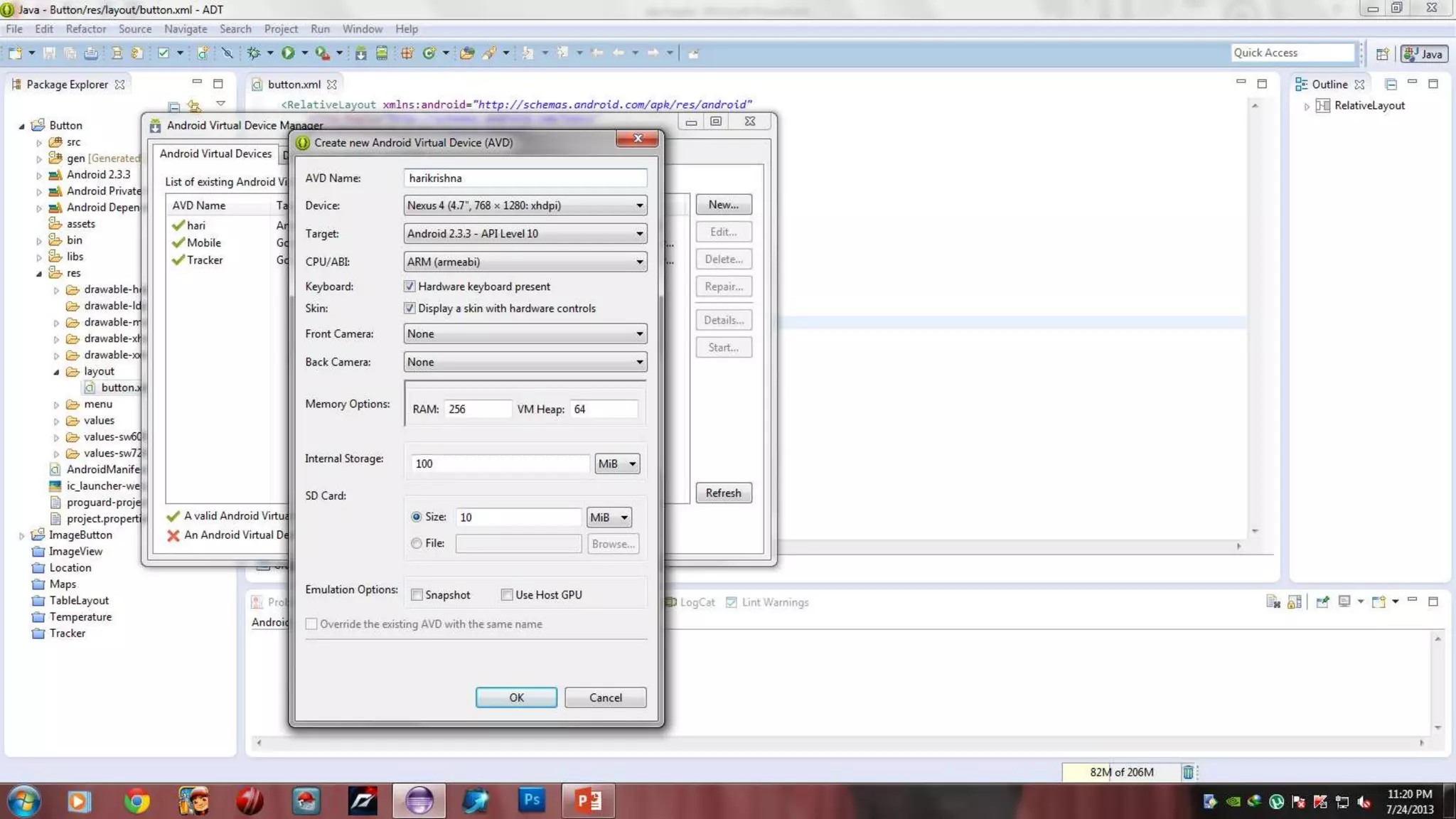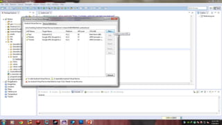 Android Virtual DeviceManager (AVD) • This AVD is nothing but a smartphone which is useful to check the outputs and test your code before using it in phone. • First go to Window->Android Virtual Device Manager. • Click on New option • Name can be any of your kind • Device also can be any of your kind • Target SDK must be equal to the platform you have selected for the project Ex: I have chosen API 10 for my project, so I have to give target SDK as 10 • CPU may be as your wish. It may be ARM, Intel x86 or MIPS. • Keep RAM as 256 up-to API 11. After 10 put it as 512 • Internal Memory as we need not use it may be of 100 • SD Card size is of range starting from 9MB, so give there 10 • Click OK, then you can see the AVD in ABD manager • If we are designing any camera application, then we need camera otherwise place it as none for both front end and back end camera.
