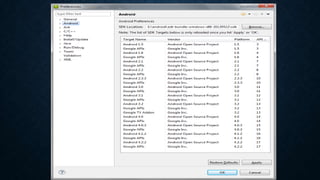 Steps for installingAndroid SDK on eclipse • Open the eclipse and create a workspace • Workspace is the place where your projects will be saved • Next go to Window->Preferences • Then click on option Android • Provide the path of android SDK and click on apply • Then you can observe the platforms get installed