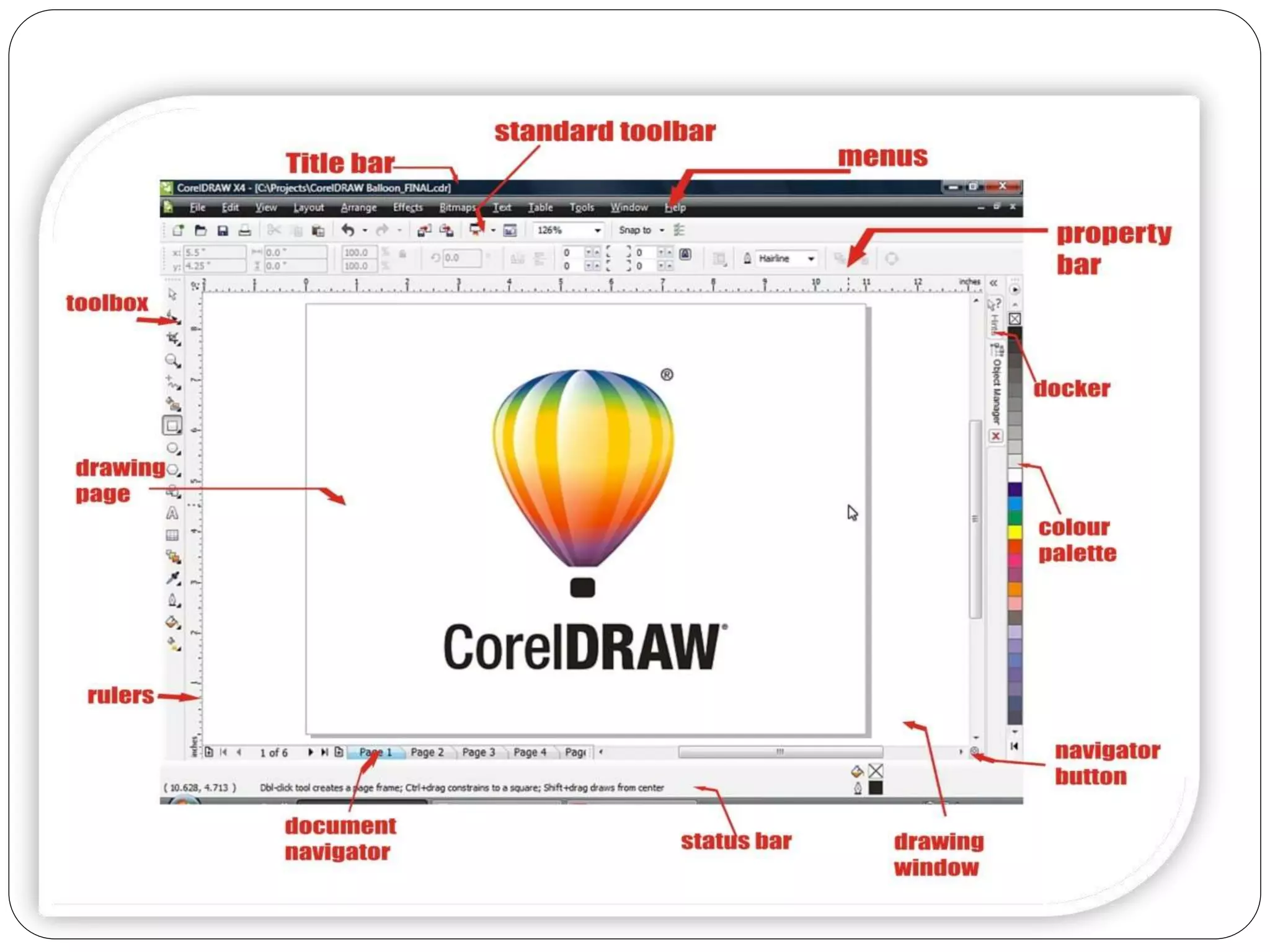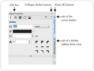 Overview of CorelDRAW's user interface components, including toolbars, docker, rulers, and document palette for effective navigation and drawing.