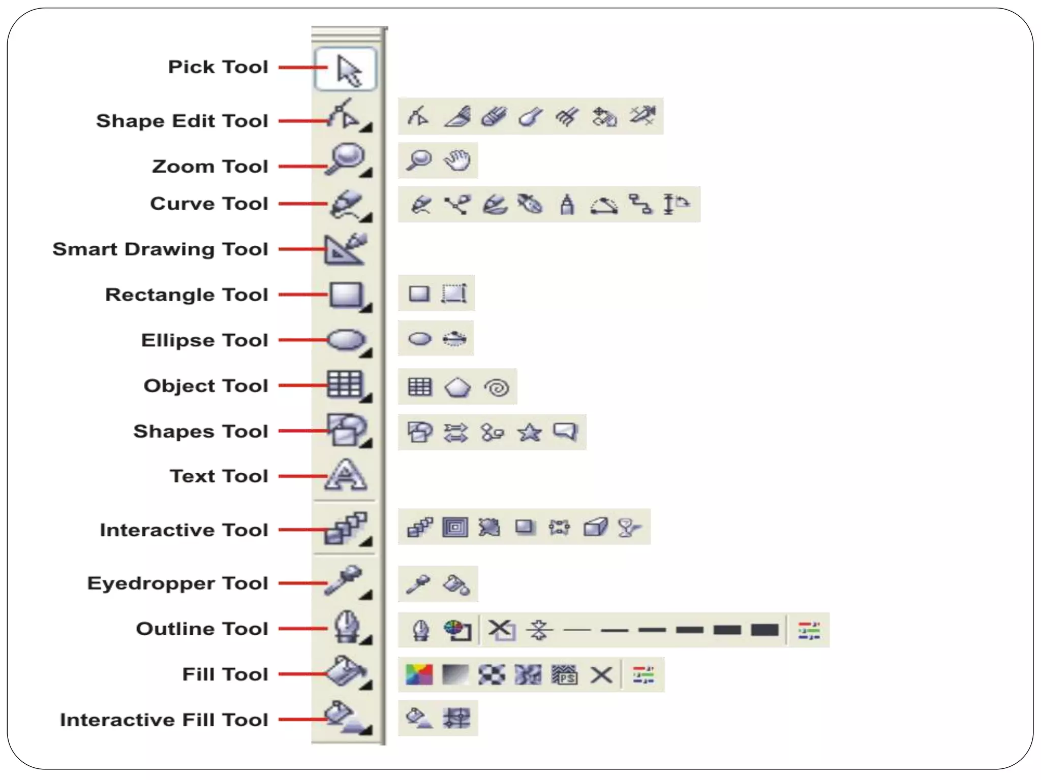 A comprehensive overview of CorelDRAW tools, including selection, shape editing, cropping, and various drawing tools for effective graphic design.